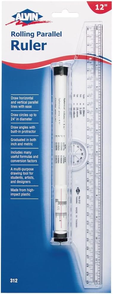 ALVIN Rolling Parallel Ruler, 12 Inch, Model 312, Multipurpose Imperial and Metric Rolling Ruler for Students, Artists, and Designers, Ideal for Drawing Parallel Lines, Curves and Arcs – 12 inches