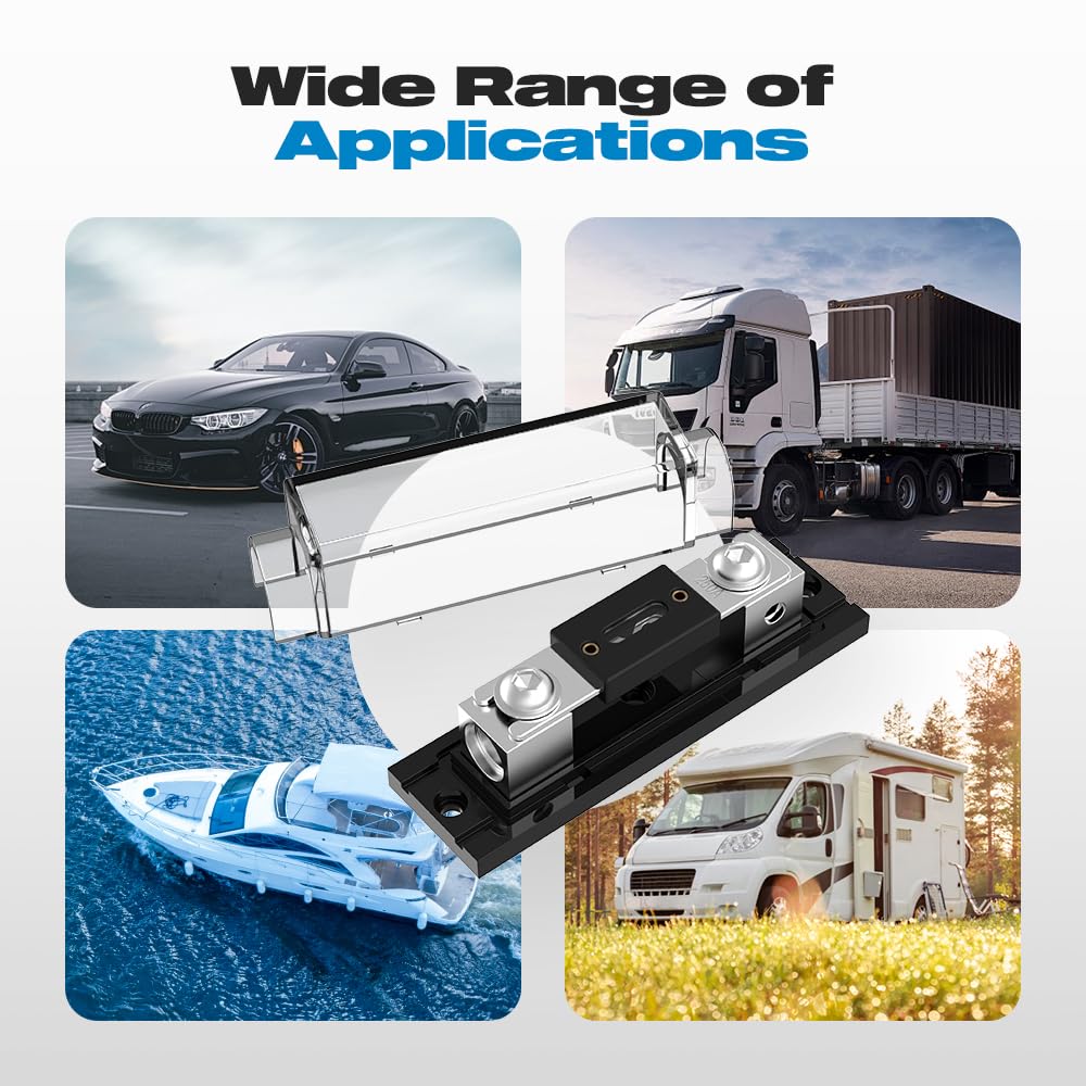 High Quality Fuse Holder: High temperature base and cover, transparent housing made of high quality plastic, the status of the fuse holder is clearly displayed.ANL fuses are made of zinc alloy, which has good electrical conductivity, heat resistance and flame retardancy.
