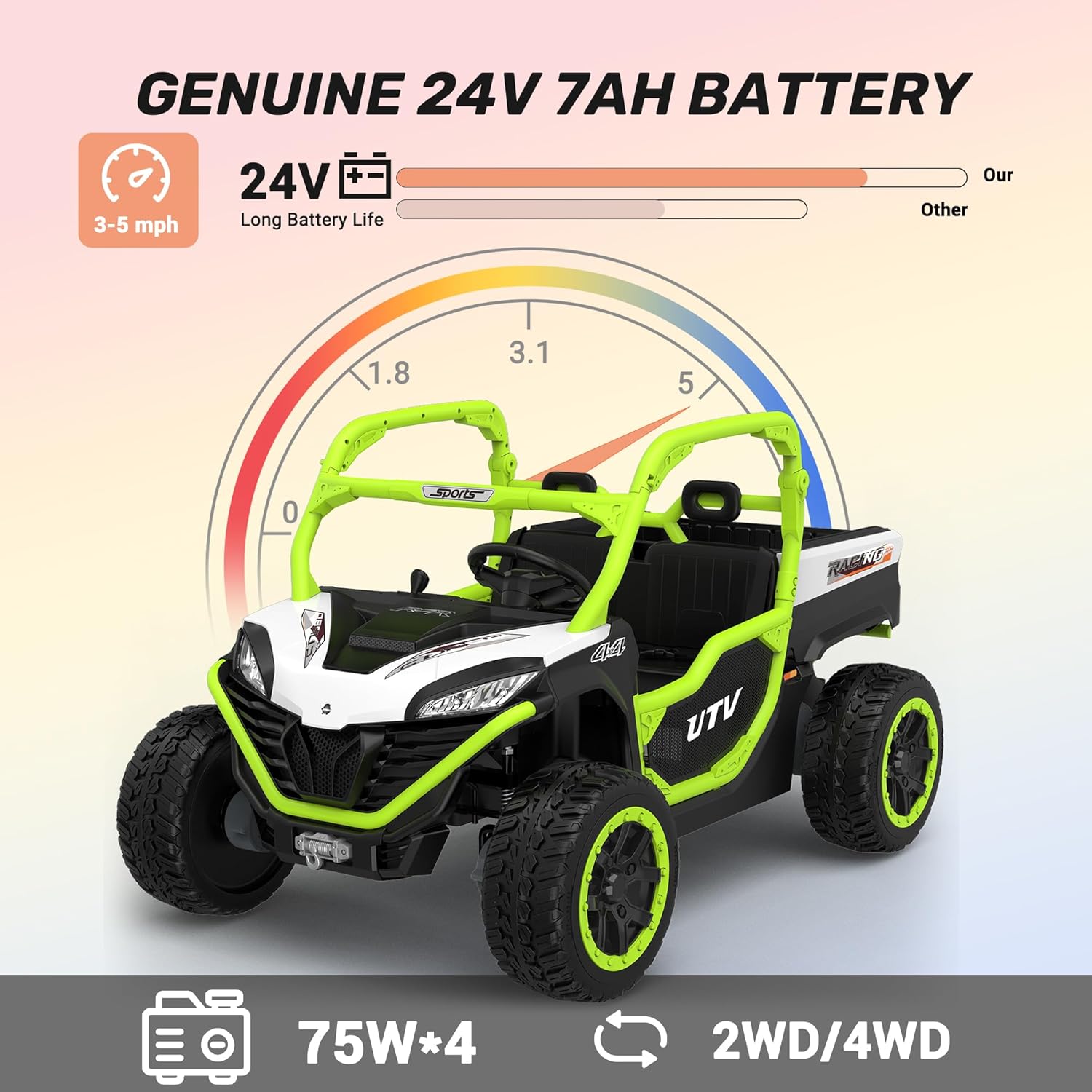 【24V 4*75W 4WD Ride On Toy】Powered by an upgraded high-capacity 24V 7Ah rechargeable battery and driven by 4×75W motors, this kid’s truck has longer battery life and more powerful performance. Its speed is adjustable between 3.7-5 mph. Moreover, it is equipped with 4 high-quality wear-resistant EVA tires and 4 spring shock absorbers, which provide an excellent grip and make it more suitable to drive on different terrains, such as asphalt roads, lawns, gravel and cement roads