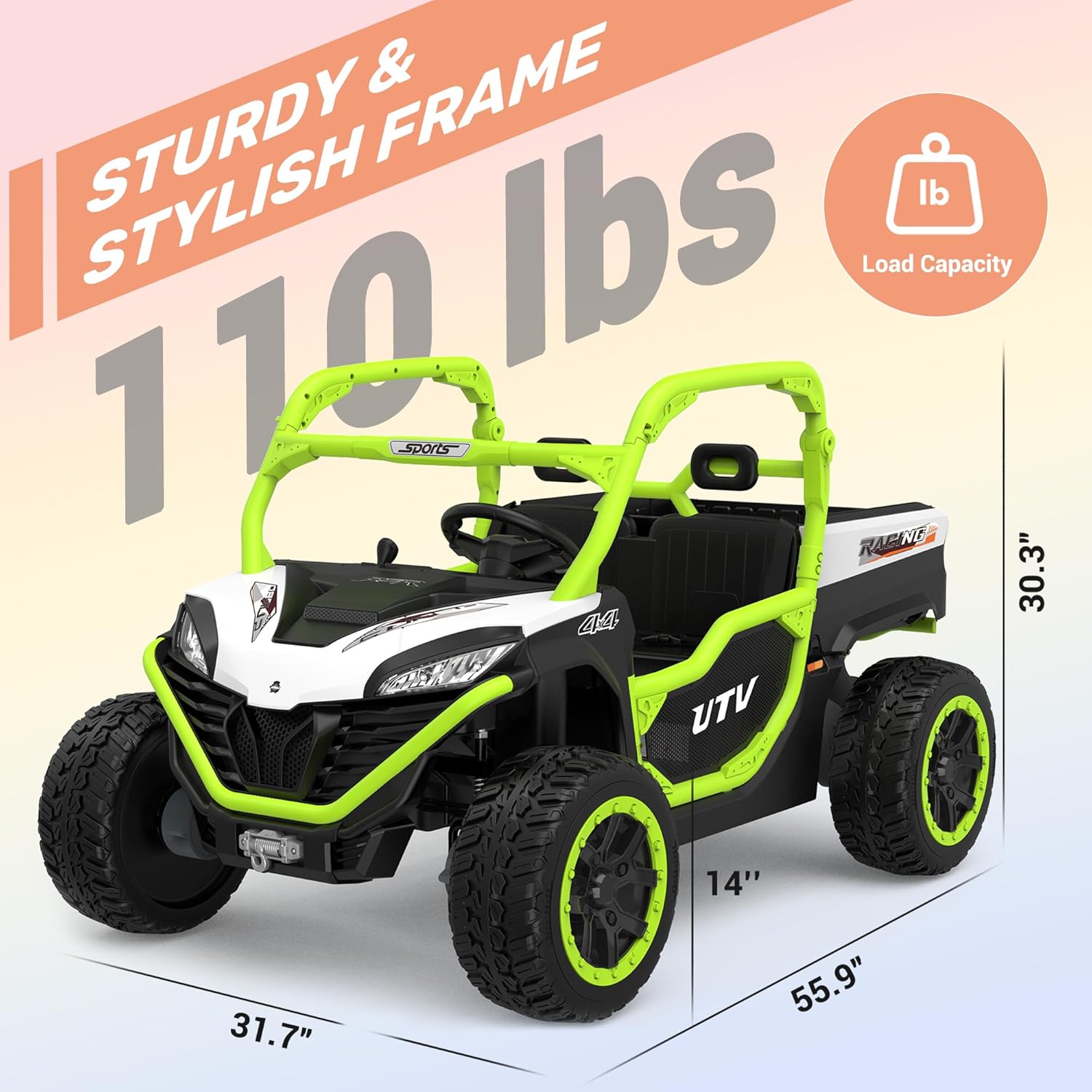 【Spacious 2-Seater Truck】ANPABO 2-Seater kids UTV with 21.2” extra-wide seats offers ample room for kids to stretch their legs and enjoy the ride. Each seat is equipped with an independent safety belt. Its two seaters design allows 2 kids to play together and the max load capacity is 110 lbs. Let your kid explore endless fun with his/her playmate