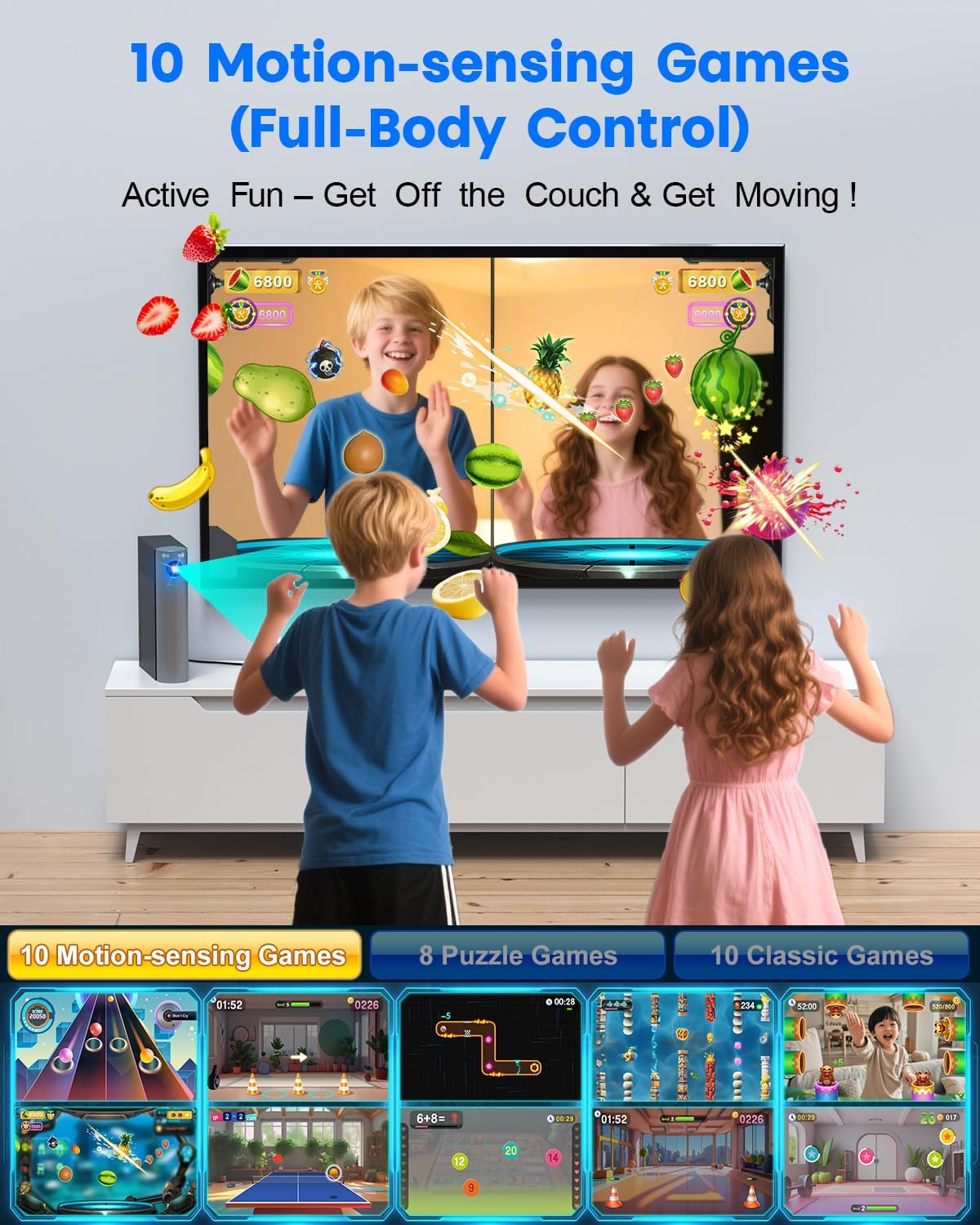 【28 Fun Games Included – Motion, Puzzle & Classics】 More awesome game packs are in the works and will be available for Free Download on the official website later. Transform your living room into an indoor playground.MetFut gaming system comes with 28 preloaded thrilling games, carefully selected based on big data research for maximum popularity and fun, including Joy Cut Fruits, Swin Together, Undersea Treasure Hunt, Rhythm Balls, etc. Perfect for family game nights, parties, or indoor exercise—there’s something for everyone.