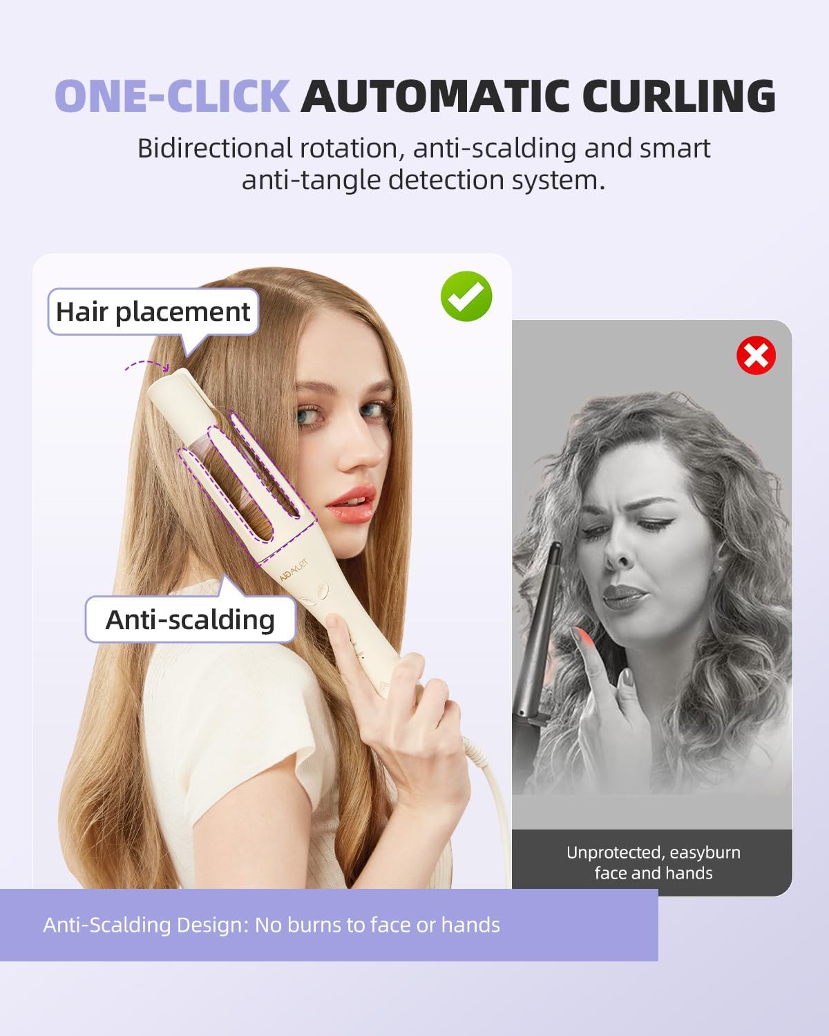 [Anti-Scald & Anti-Tangle] This rotating curling iron features a cool-touch 360° anti-scald design, making it safe even for beginners. Its smart anti-tangle mechanism detects and quickly resolves knots, ensuring a smooth styling experience. This hair curling iron also features a 30-minute automatic shut-off function to prevent fires and protect your life and property.