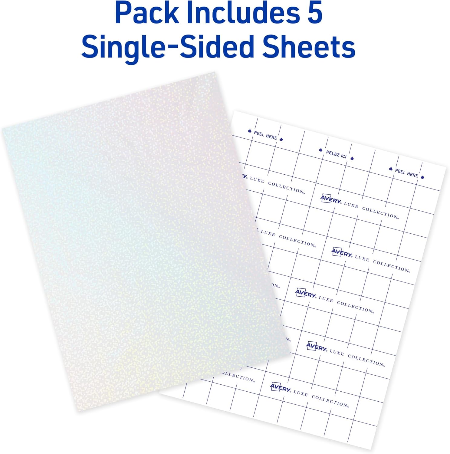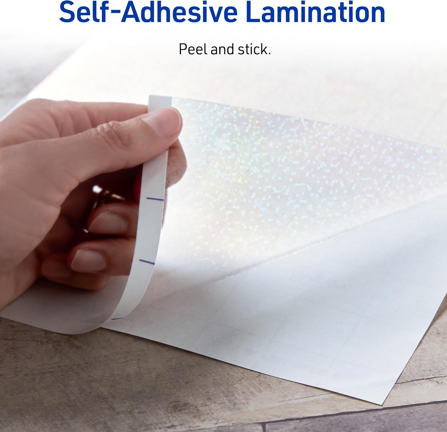Instantly add a dazzling holographic effect to stickers, certificates, scrapbooks, and more with Avery 73609 Luxe Collection Holographic Laminating Sheets with Speckled Dots. These clear self-adhesive lamination sheets feature a subtle speckled dot pattern that catches and reflects light from different angles, creating a brilliant yet elegant shimmer perfect for enhancing a wide variety of projects. Perfect for both crafting and document protection, these versatile lamination sheets can be used as a holographic overlay or applied together to seal and safeguard important papers, photos, crafts, and more—no laminating machine required. The durable, water-resistant design helps protect against spills, scuffs, and everyday wear and tear, keeping projects looking pristine. For easy application and precise cutting, the backing sheet features a printed grid, allowing you to align, measure, and trim each laminating sheet with confidence. Pair with Avery Sticker Paper to create custom, holographic stickers that stand out. Whether you’re adding a shimmering touch to marketing materials or product packages, preserving keepsakes, or laminating recipe cards, Avery Holographic Laminated Sheets make it simple to achieve a professional-quality finish with a stunning, eye-catching shine. This item includes a total of five self-sealing 9″ x 12″ laminating sheets.
