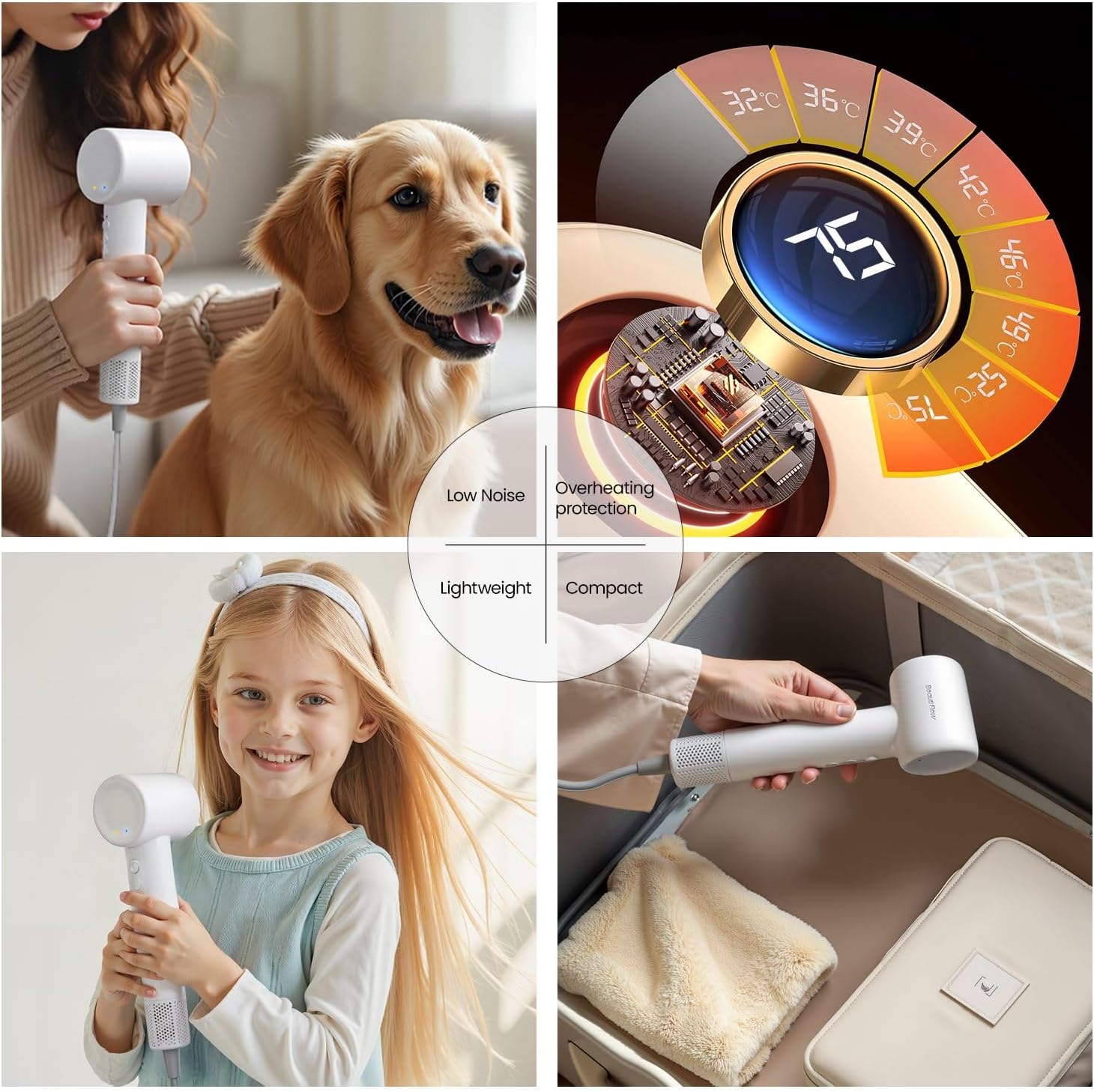 FAST DRYING: Beauti Flow Secadora de Pelo Para Mujer. Compared to other hair dryers, our hair dryer is equipped with a genuine 110,000 rpm high-speed brushless motor. allowing for ultra-fast wet-to-dry styling without compromising hair health. Our hair dryer includes an excellent temperature control system, keeping your hair free from frizz and heat damage