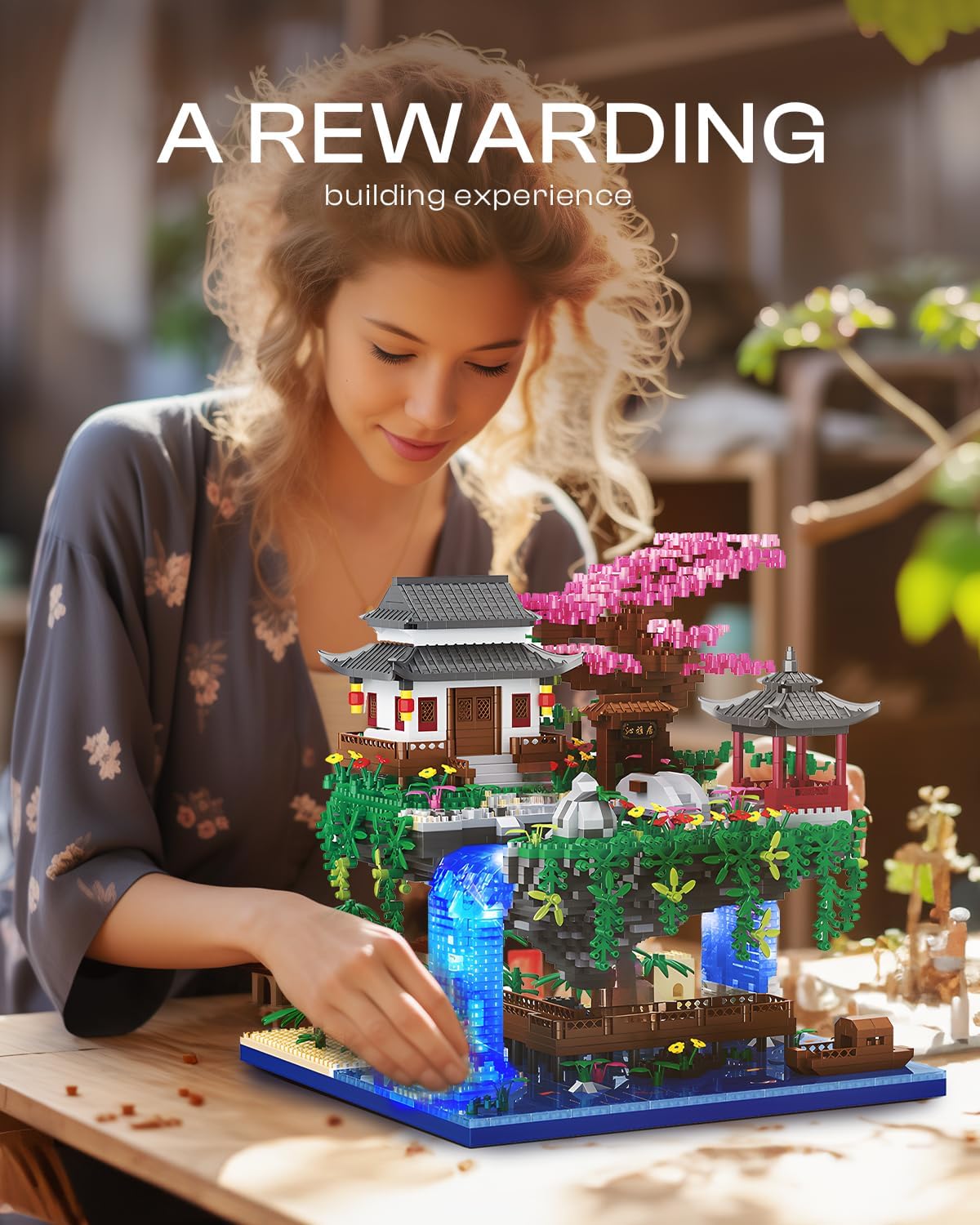 Unique Design: The exquisite cherry blossom tree building set is uniquely shaped with the island suspended in the air and supported by a waterfall. The floating island contains a palace surrounded by beautiful plants and flowers. The overall design has a strong Japanese architectural style, and the building model with light strings is more realistic. you will be amazed when you finish it