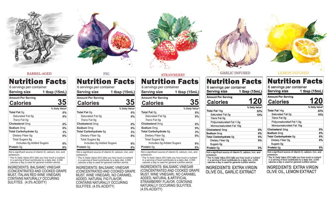 Barrel Aged Balsamic, Fig Balsamic, Strawberry Balsamic, Lemon Infused Olive Oil, Garlic Infused Olive Oil White Balsamic, Fig Balsamic, Cherry Balsamic, Smoky Jalapeno Infused Olive Oil, Garlic Infused Olive Oil White Balsamic, Strawberry Balsamic, Barrel Aged Balsamic, Lemon Olive Oil and Extra Virgin Olive Oil Extra Virgin Olive Oil, Garlic Infused, Lemon Infused, Rosemary Infused, Smoky Jalapeno Infused Olive Oil Peach Balsamic, Fig Balsamic, Strawberry Balsamic, Raspberry Balsamic, Barrel Aged Balsamic