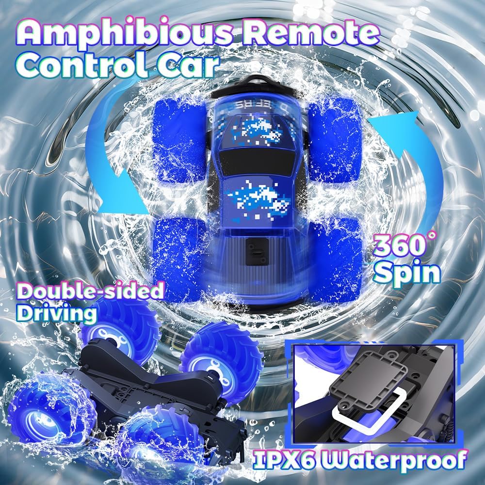 Extreme Power & High Performance – Engineered with dual powerful motors and 4WD system, this RC Stunt Car delivers explosive acceleration and unstoppable traction. Its innovative air-cushion wheels absorb shocks while gripping any surface, mastering 360° spins, underwater flips, and wheelie stunts with ease. The dynamic LED lights flash during action, making every move more thrilling! Perfect as monster trucks for boys who crave adventure, this Amphibious RC Car is the ultimate rc truck for kids age 6-8 and 8-12 to show off epic skills at the park, backyard or pool!