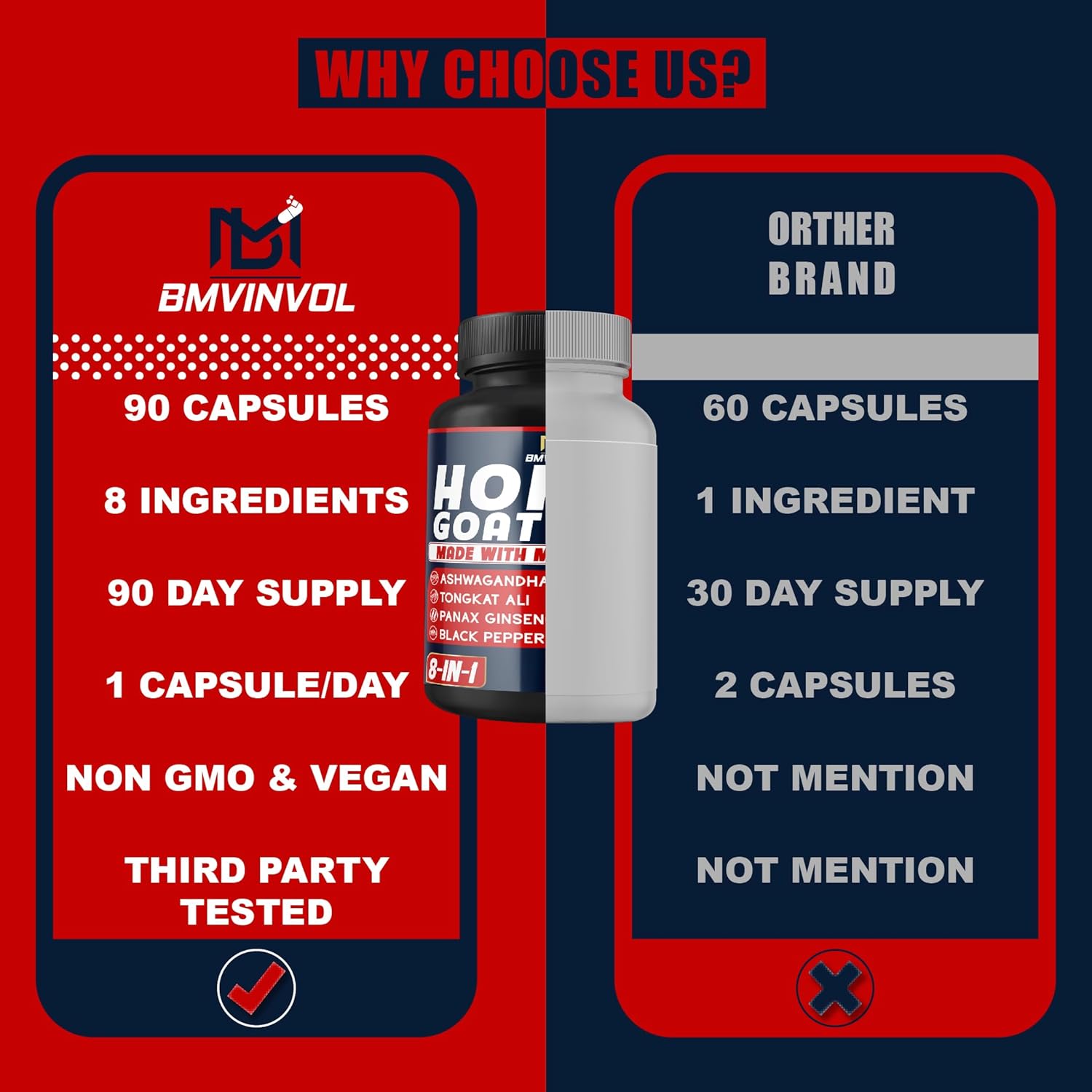8-in 1: Horny Goat Weed, Panax Ginseng, Tribulus, Ashwagandha, Maca, Tongkat Ali, Nettle, Black Pepper.