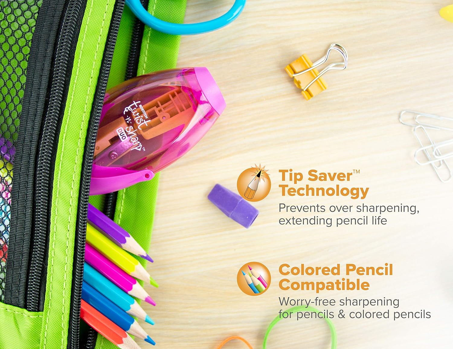 With this 3-pack, now you can sharpen two pencil sizes with a colorful assortment of jumbo pencil sharpeners! Each sharpener features two holes – the first for standard pencils and the second for jumbo or “starter” size pencils. Starter pencils are easier to hold and maneuver because they are thicker than regular pencils, and therefore are the ideal writing utensils for beginning writers. And with this versatile sharpener, now you can sharpen both sizes! By ordering this 3-pack, you. A member of the Twist-n-Sharp family, this product also uses a ratchet mechanism. This allows you to sharpen pencils with more speed and ease! An easy-open shavings tray ensures a clean and tidy desktop. And the Tip Saver Technology prevents over-sharpening, prolonging pencil life. The numerous features of the Twist-n-Sharp Duo Pencil Sharpener make it a great option for kids and classrooms everywhere!