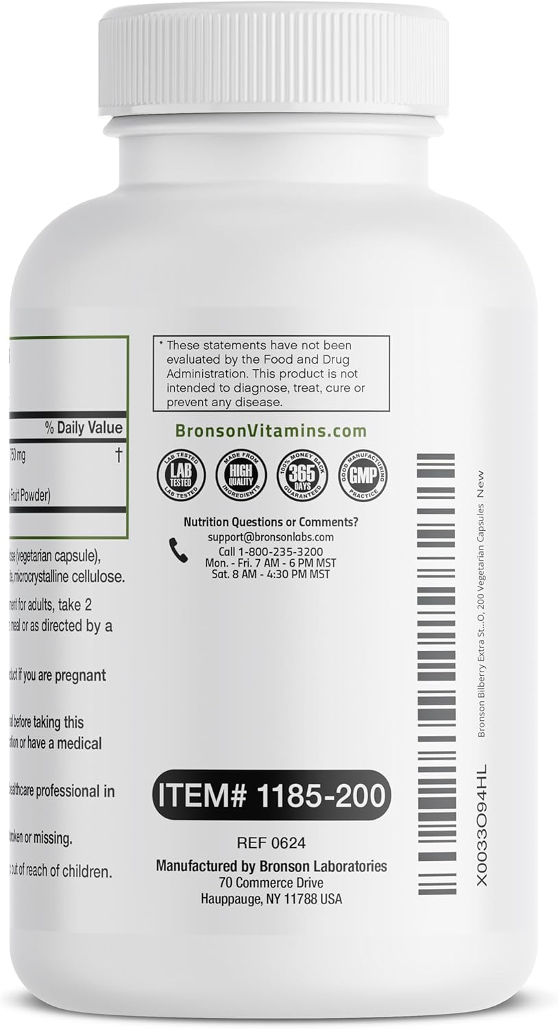 Bronson Bilberry Extra Strength helps support eye health and overall vision.* Bilberries, which are a close relative to Blueberries, are known for their antioxidant properties that help to protect the body from harmful free radicals.* These beneficial berries have been said to promote improved vision during low light conditions and help the eyes adapt more easily to light changes.* Laboratory tested Non-GMO, Gluten-Free and Soy-Free, Bronson Bilberry Extra Strength is in-house tested and carefully manufactured by trained professionals in our state-of-the-art facility that is located in Hauppauge, New York. Bilberry Extra Strength is Vegan/Vegetarian friendly and contains no ingredients derived from animals.