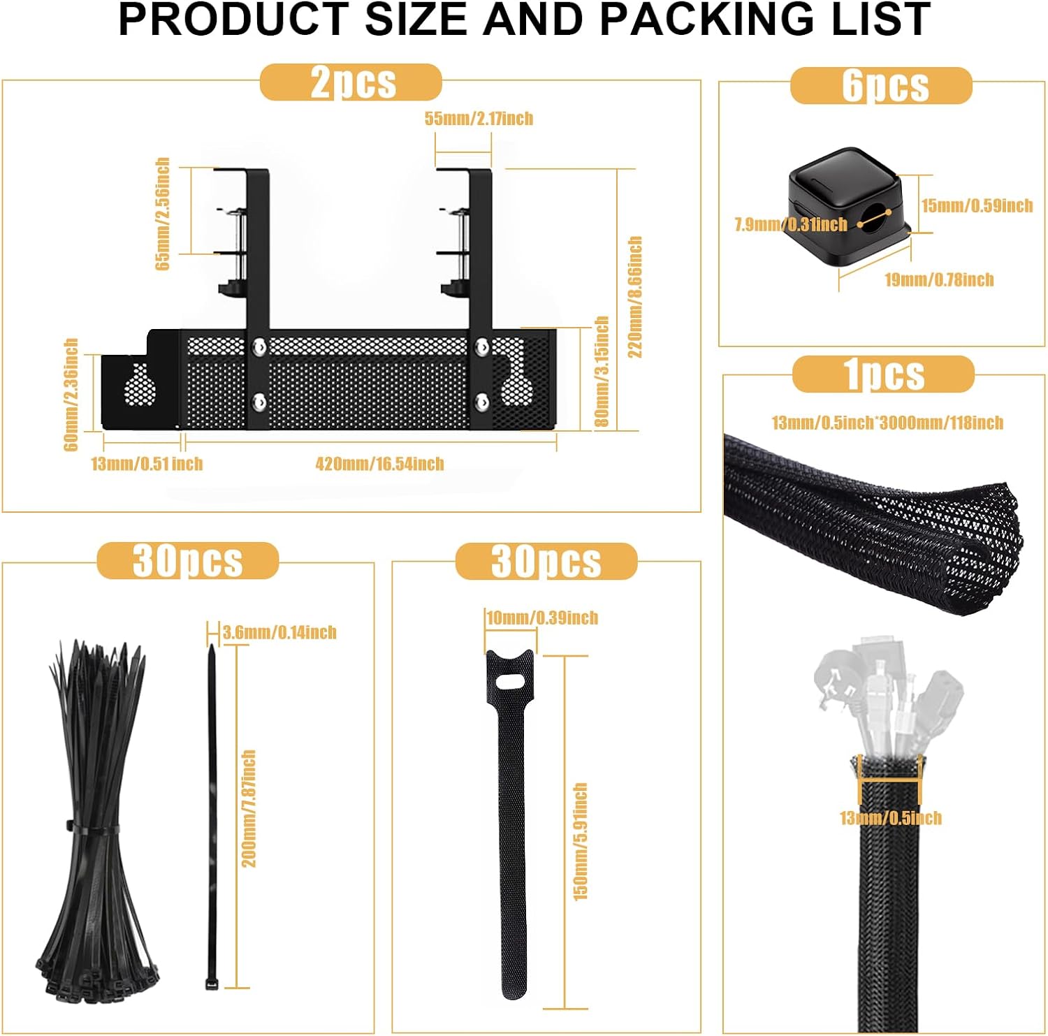 【Cable Management Tray kit with 10ft – 1/2 inch Braided Cable Sleeve】Our Cord management under desk is made of high-quality carbon steel, which is sturdy and durable. Multiple accessories are included. Package list: 2x 15.7″ Cable Management Trays; 1x 10ft Braided Cable Sleeve; 30x 8″ Black Zip Ties; 30x T-shape Reusable Cable Ties; 6x Magnetic Cable Holder. These reusable accessories equipped can better help you organize messy cables and other household items.