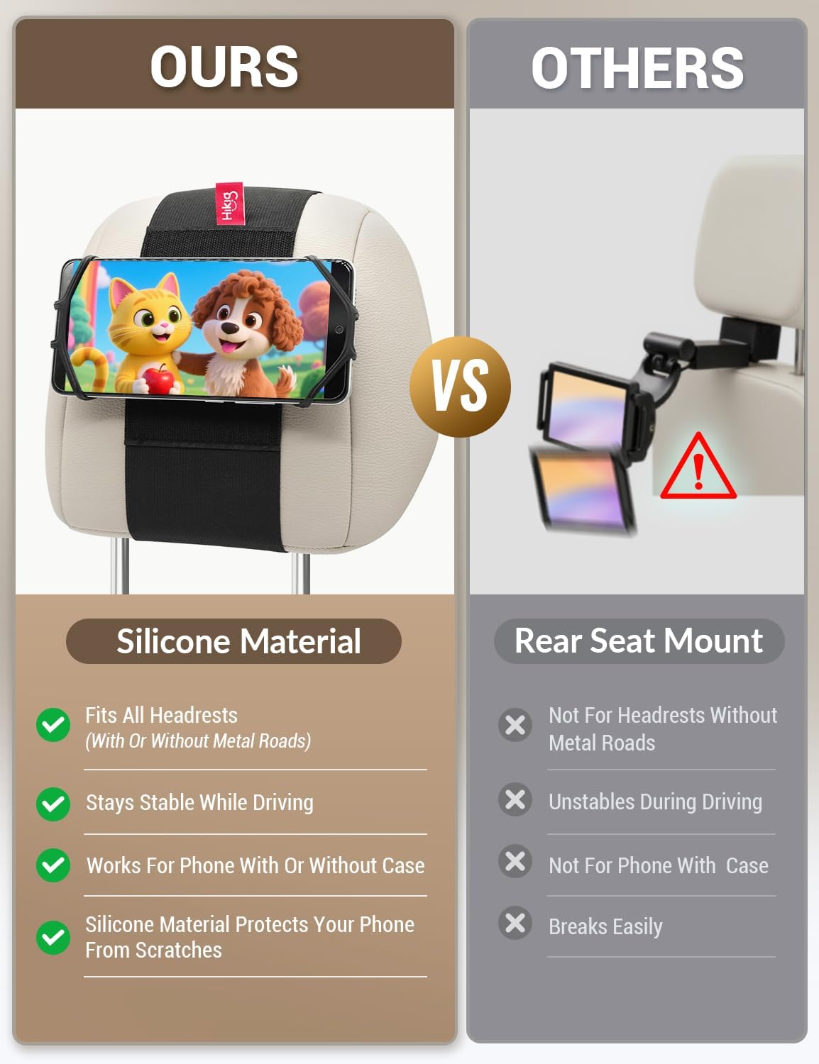 [Durable & Safety Material]- Our car headrest phone holder is made of premium flexible and soft silicone material, it fit snuggly won’t fall off even during a big bump. The holding net can protect your phone and game device from scraping.