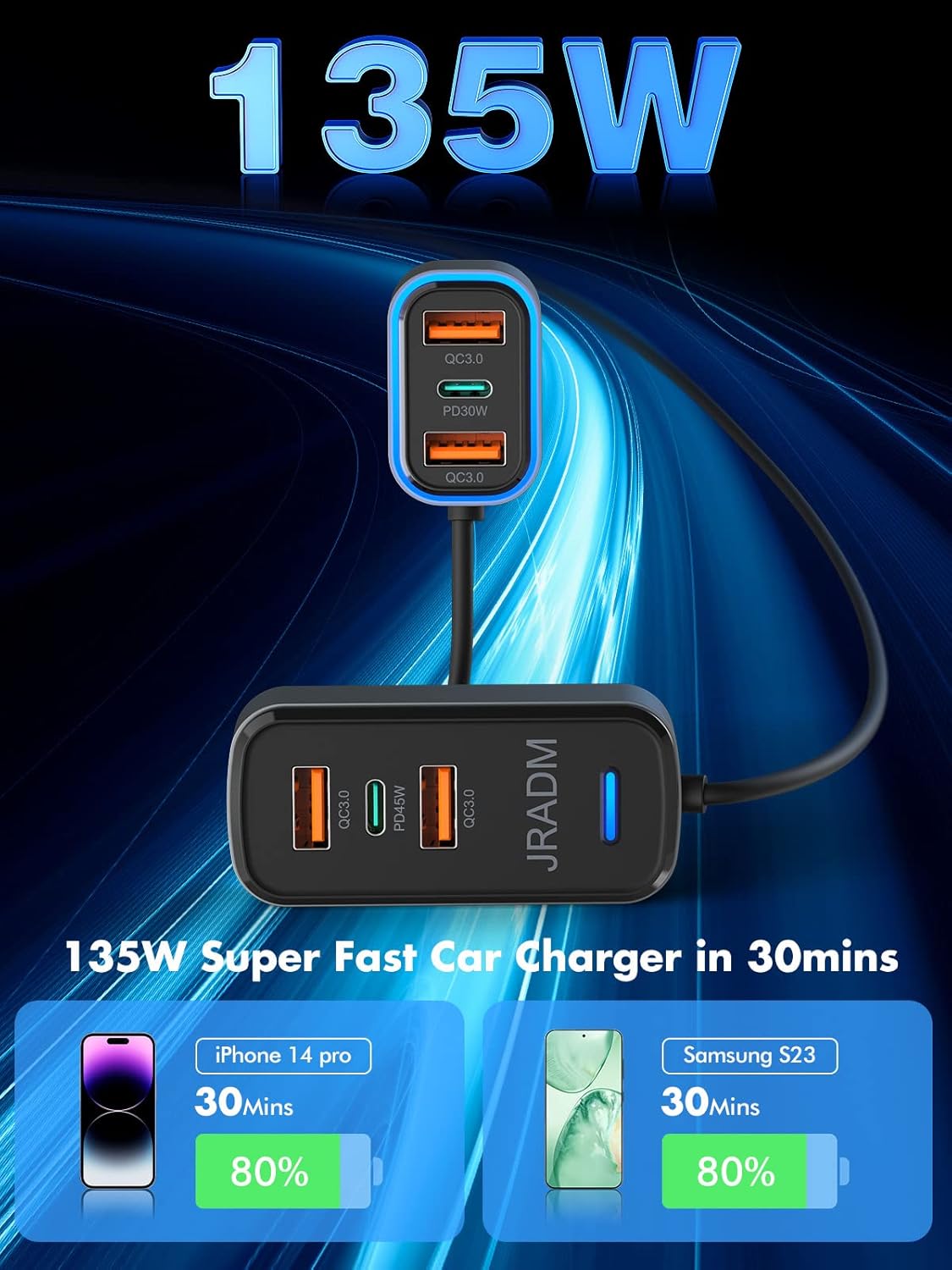 【135W Fast Car Charger】The 6-Port Super Fast USB Car Charger has 2 PD3.0 and 4 QC3.0 Ports. The driver’s side 60W (30W Type-C + 30W USB-A) can charge your iPhone 15/14/13 from 0~80% in 30 minutes. The back seat has 75W (45W Type C + 30W USB-A) to charge your Samsung Galaxy S24/S23/S22/S21/iPad Pro from 0%~80% in 30 minutes. It works with all USB devices to provide fast charging. It can identify any device you plug in and give it the best charging efficiency.