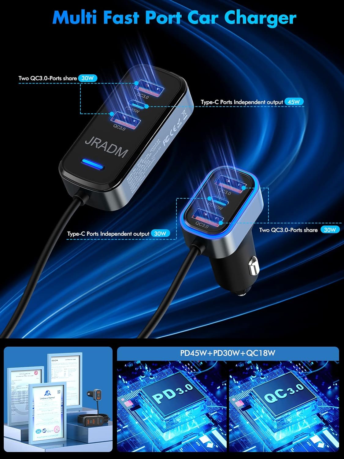 【Features】The ports can charge 6 devices at the same time without slowing down. An intelligent IC chip inside detects and provides the best power for your devices. The front seat has 60W with 3 Ports, Type-C Ports are independent outputs(PD3.0 Port + Dual QC3.0 USB Port). The rear seat has 75W with 3 Ports, Type-C Ports are independent outputs (PD3.0 Port + Dual QC3.0 USB Port). Each port can fast charge. It’s designed for home and large group travel charging.