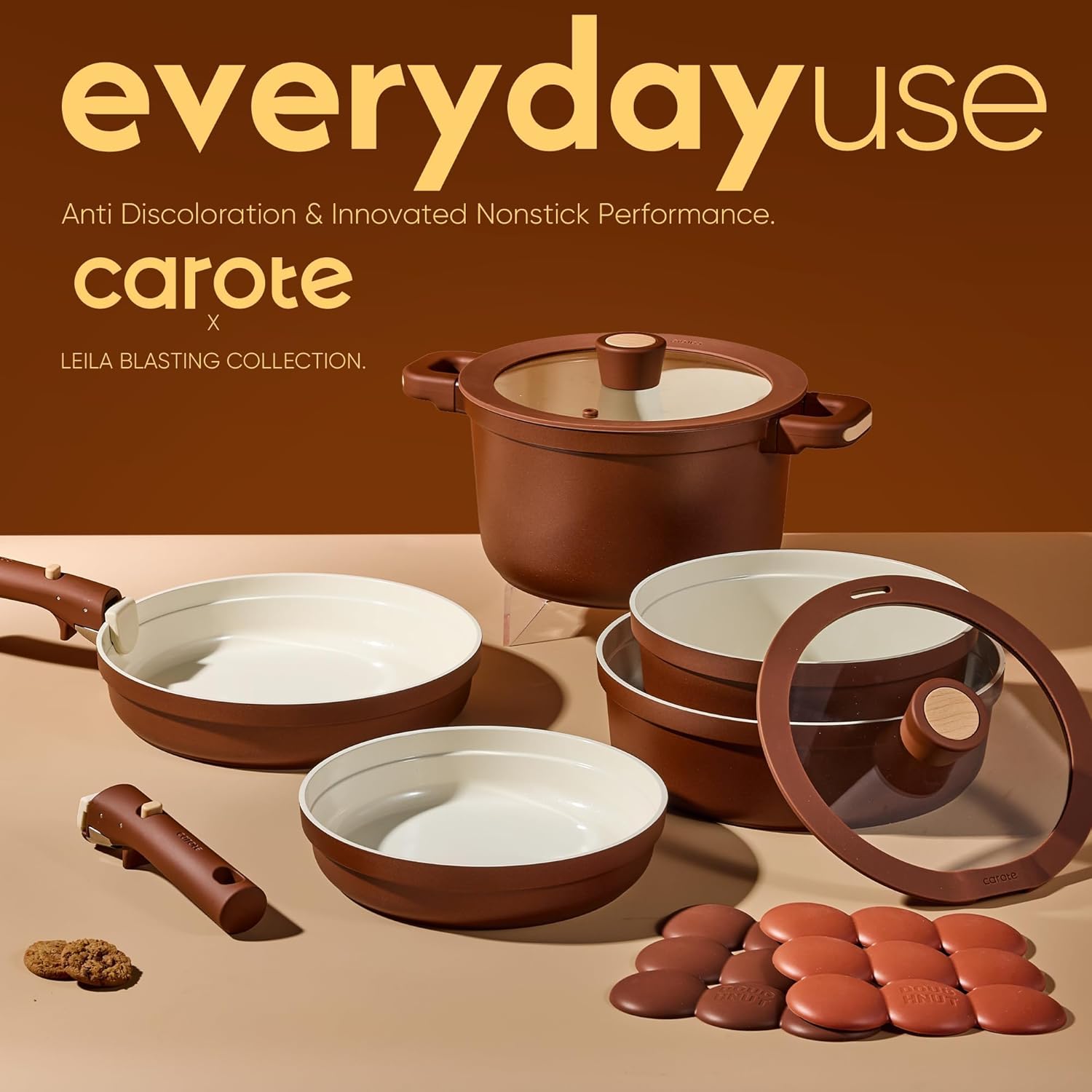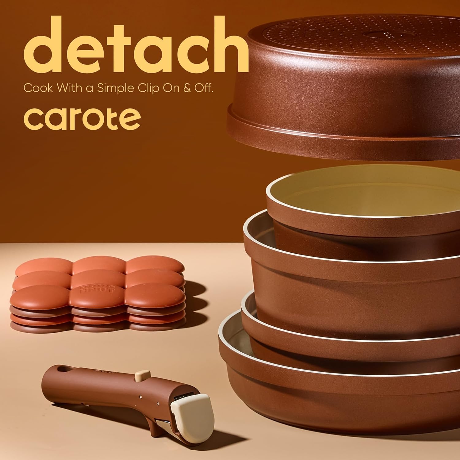 The wide rim design allows for easy stacking and dustproof storage. Optimal storage with the handles off saves up to 70% more space, keeping your kitchen neat and organized