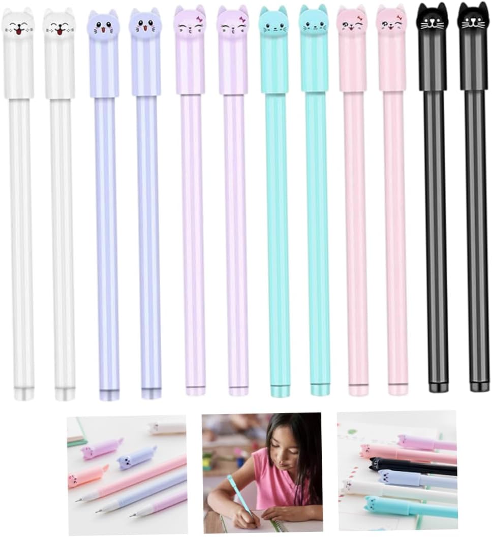 The package includes 12 pcs cat gel pens, the has 6 colors: black, blue, green, purple, white, , which is enough for your daily use.