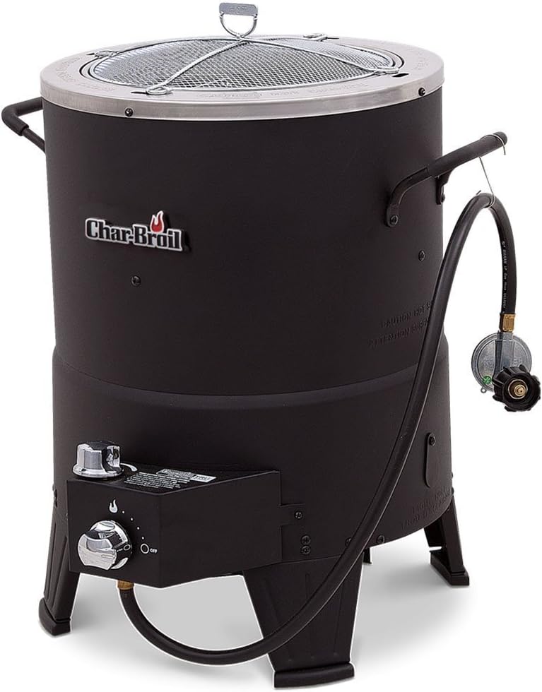 The Char-Broil Big Easy TRU-Infrared Oil-less Turkey Fryer is the stress-free way to fry your turkey. With no hot cooking oil to purchase, splatter, or dispose of, the Char-Broil Big Easy gives you a delicious, safe, and simple alternative to oil-fried turkey. The Big Easy uses infrared heat to cook a turkey from start to finish just as quickly as oil-frying – and, of course, food cooked without oil is healthier, too! The meat is always cooked evenly inside of a double-wall cylindrical cooking chamber, powered by a fully enclosed propane burner: Char-Broil’s patented Heat Wave infrared technology prevents flare-ups, eliminates hot and cold spots, and delivers juicy, crisp, and flavorful results every time. Safely cook a turkey (up to 16 lbs.) or chicken in about 8 to 10 minutes per pound – there’s no waiting for the oil to heat up. Roasts and most other large cuts of meat cook for slightly longer. You can prepare your bird or meat with the same injectable marinade you already use, or you can use seasoned rubs on the outside – which is not an option with traditional fryers. Experience the flavor when infrared heat circles the cooker to penetrate the meat evenly and seal in juices. The result is a bird that’s moist on the inside and crispy on the outside without the risk, hassle or added fat and calories of oil.