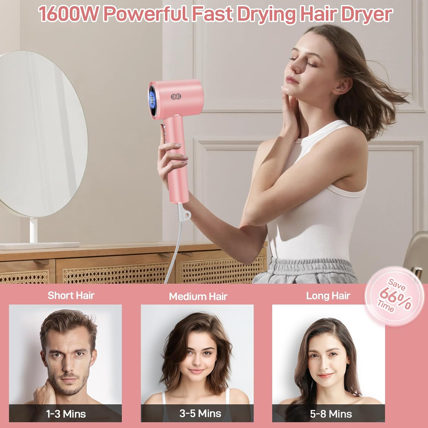 CIICII Negative Ionic Hair Dryer Professional, 120000RPM High Speed Blow Dryer (1600W Brushless/ 3-Speed/ 4-Temp & HD Display & Portable Bag) Fast Drying Hairdryer for Home, Travel & Salon (Pink)