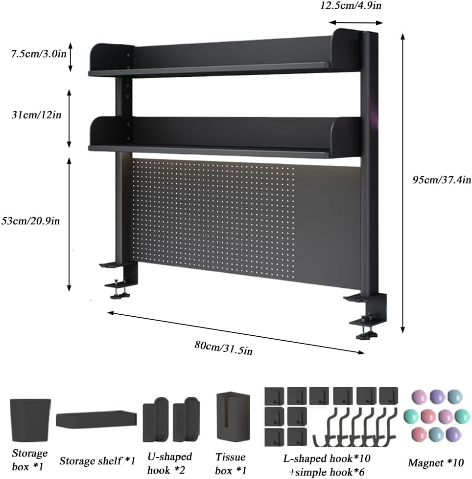 【Comprehensive Accessory Kit】This clamp on pegboard includes Storage Box*1, Storage Rack*1, U-shaped Hook*2, Paper Drawer*1, L-shaped Hook*10, Simple Hook*6, Magnet Buckle*10, which can make full use of the wall space instead of taking up much space on board