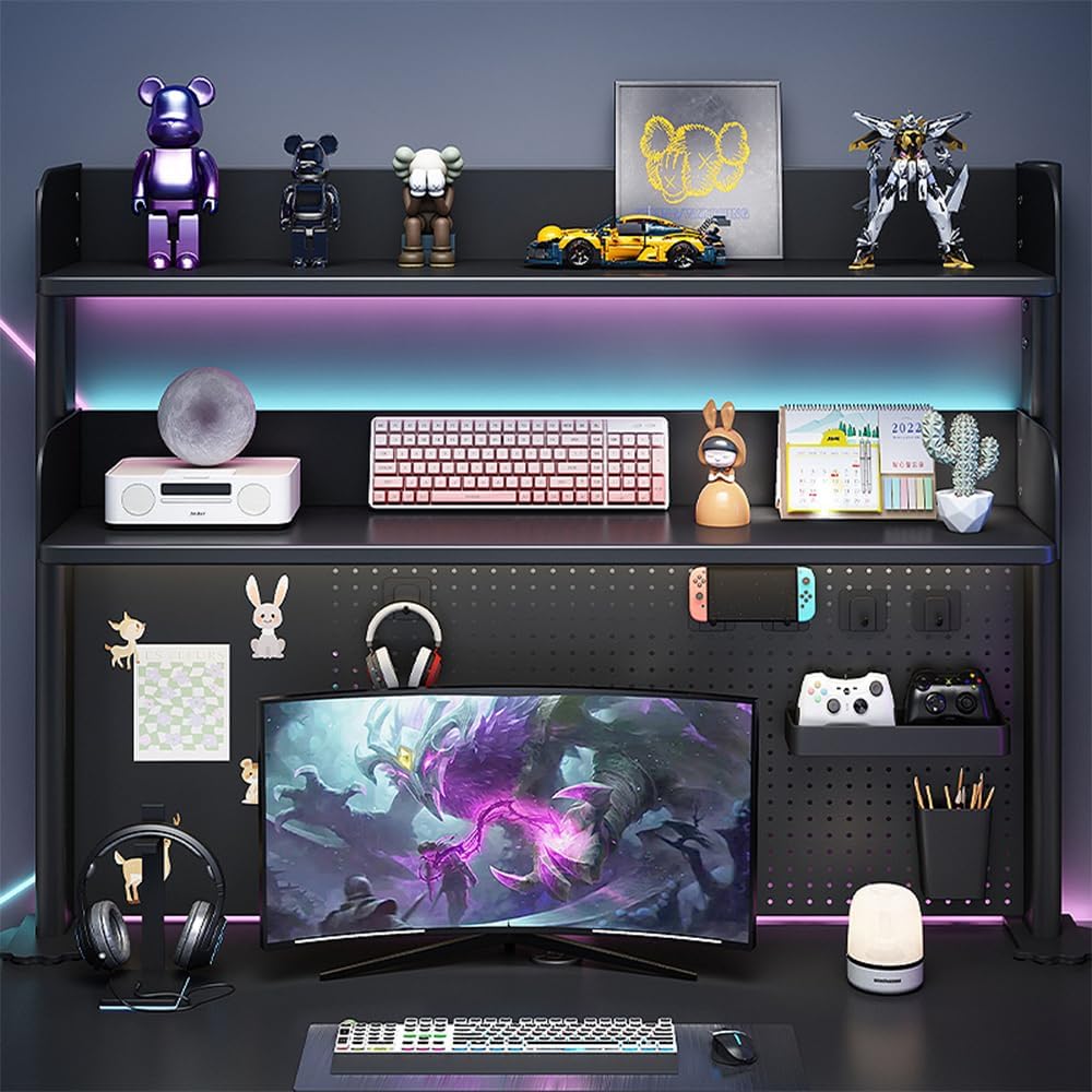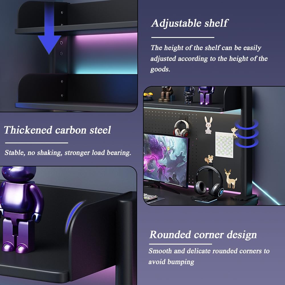 【Dual Shelf System】Two adjustable shelves stacked vertically provide storage flexibility and aesthetics. There is 12.2 inches of space between the shelves, and the bottom storage space is 20.86 inches high, which can accommodate a 28-inch computer monitor. The partitions have back and side panels to prevent items from falling.