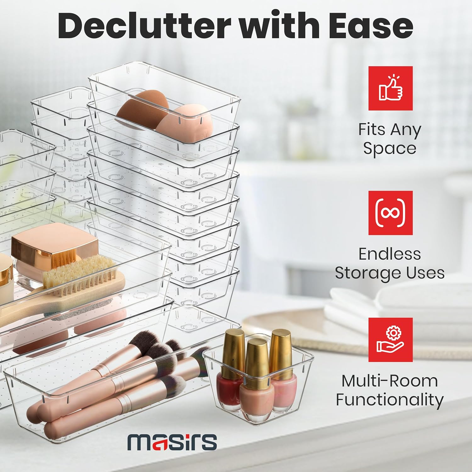 VERSATILE DRAWER ORGANIZER FOR EVERY ROOM: Tidy up kitchen drawers, bathroom vanities, office desks, and bedroom nightstands. This 25-piece clear organizer set adapts to any space, making it a must-have for streamlined storage