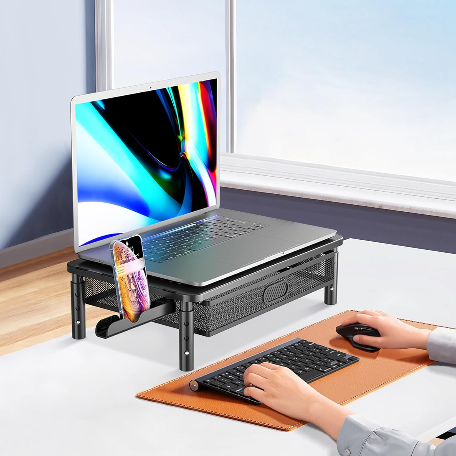 Space-Saving Efficiency: Our computer monitor riser include metal mesh slide-out drawer,foldable phone holder and side storage pocket perfect for keeping your office essentials.