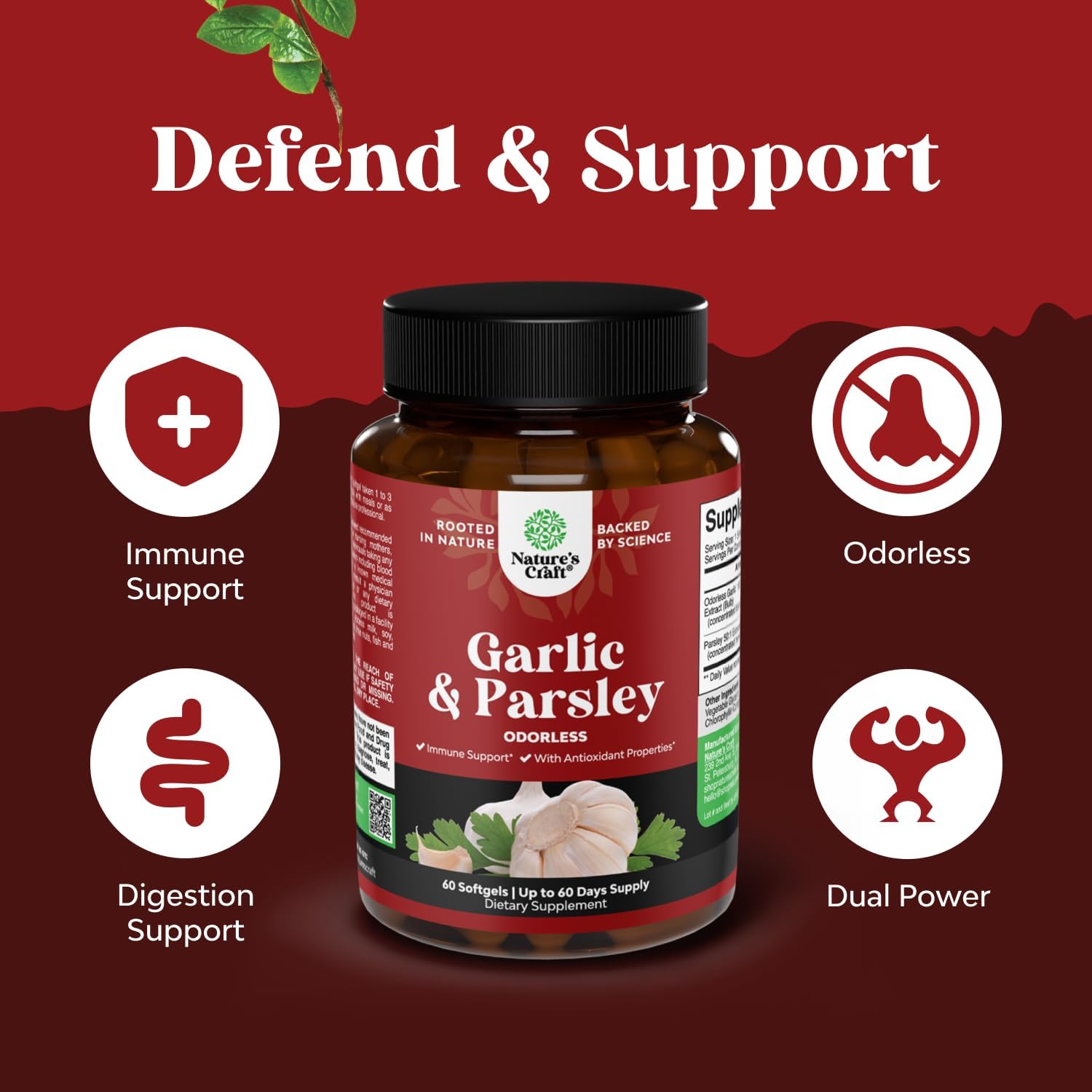 Concentrated Odorless Garlic Softgels – Parsley Extract & Aged Garlic Supplements for Circulatory Health, Digestion, Immune Support & Liver Detox – Parsley Softgels for Gut Support – 60 Ct