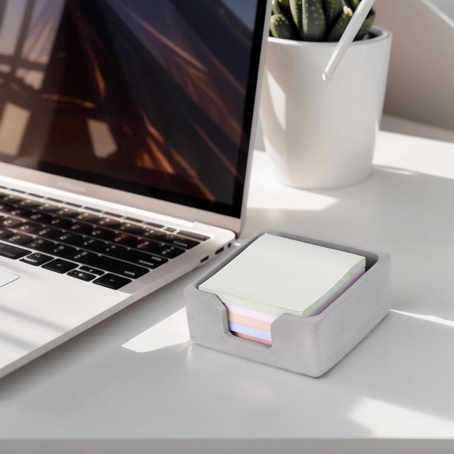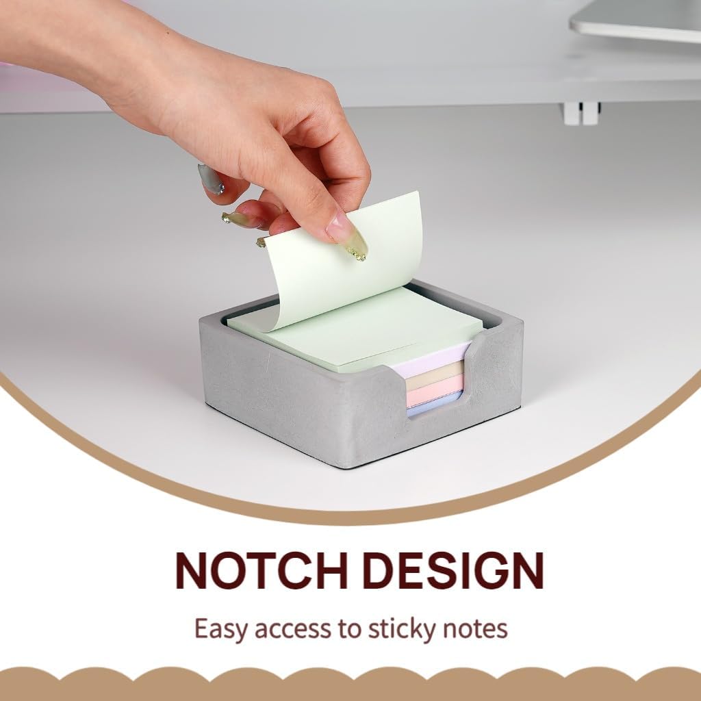 BAOHD concrete sticky note holder has some weight to it and felt pad on the bottom so it stays put on the desk and you don’t have to worry about the concrete scratching it up.Crafted from durable, high-quality concrete, this holder boasts a unique industrial-chic aesthetic that adds a touch of modern sophistication to any desk, office, or home workspace.Features a convenient open design for effortless loading and quick grabbing of sticky notes. Easy hold standard 3×3 inch sticky note pads upright, keeping them organized and within easy reach.