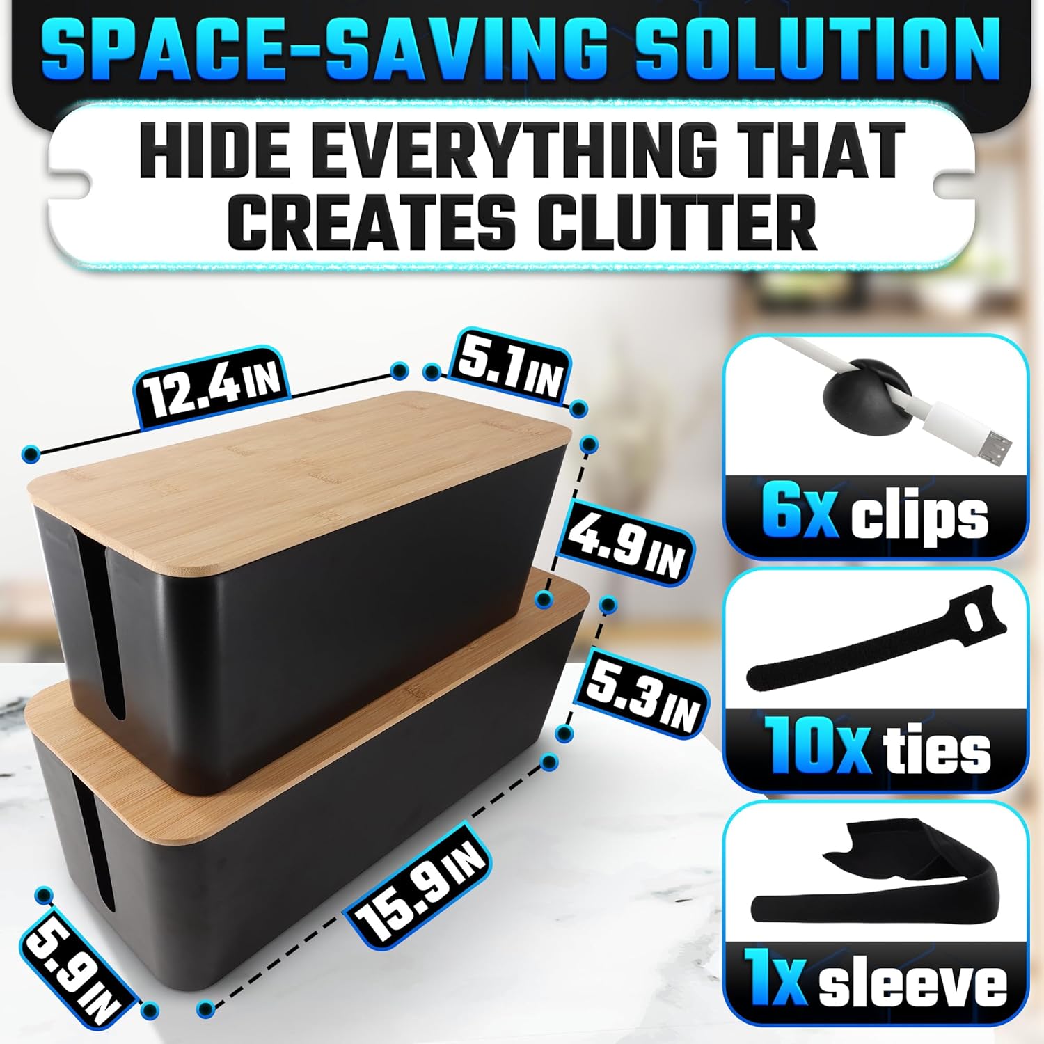 Cord Management Box Set – 2 Pack Cable Organizer Box to Hide Cords and Power Strip Kit with Clips, Reusable Ties & Sleeve – Functional, Modern Design | Medium & Large Sizes for Home & Office Use