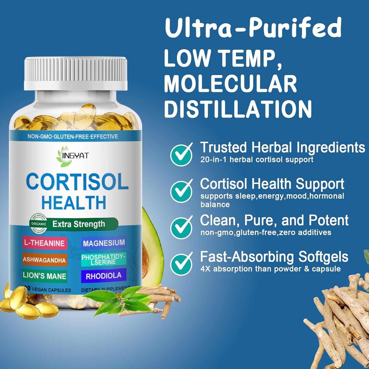 Benefits of Cortisol Detox for Women Softgels: Harness the natural power of adaptogens with JINGYAT Herbal Cortisol Support Softgels. This unique blend of L-Theanine, magnesium, Omega-3, and soothing herbs helps maintain healthy cortisol levels, promoting balance and emotional well-being. Known for its ability to enhance focus and relaxation, this formula supports mental clarity and mood stability. Encapsulated in easy-to-take softgels, it provides daily support for overall wellness, helping you feel calm, centered, and energized.