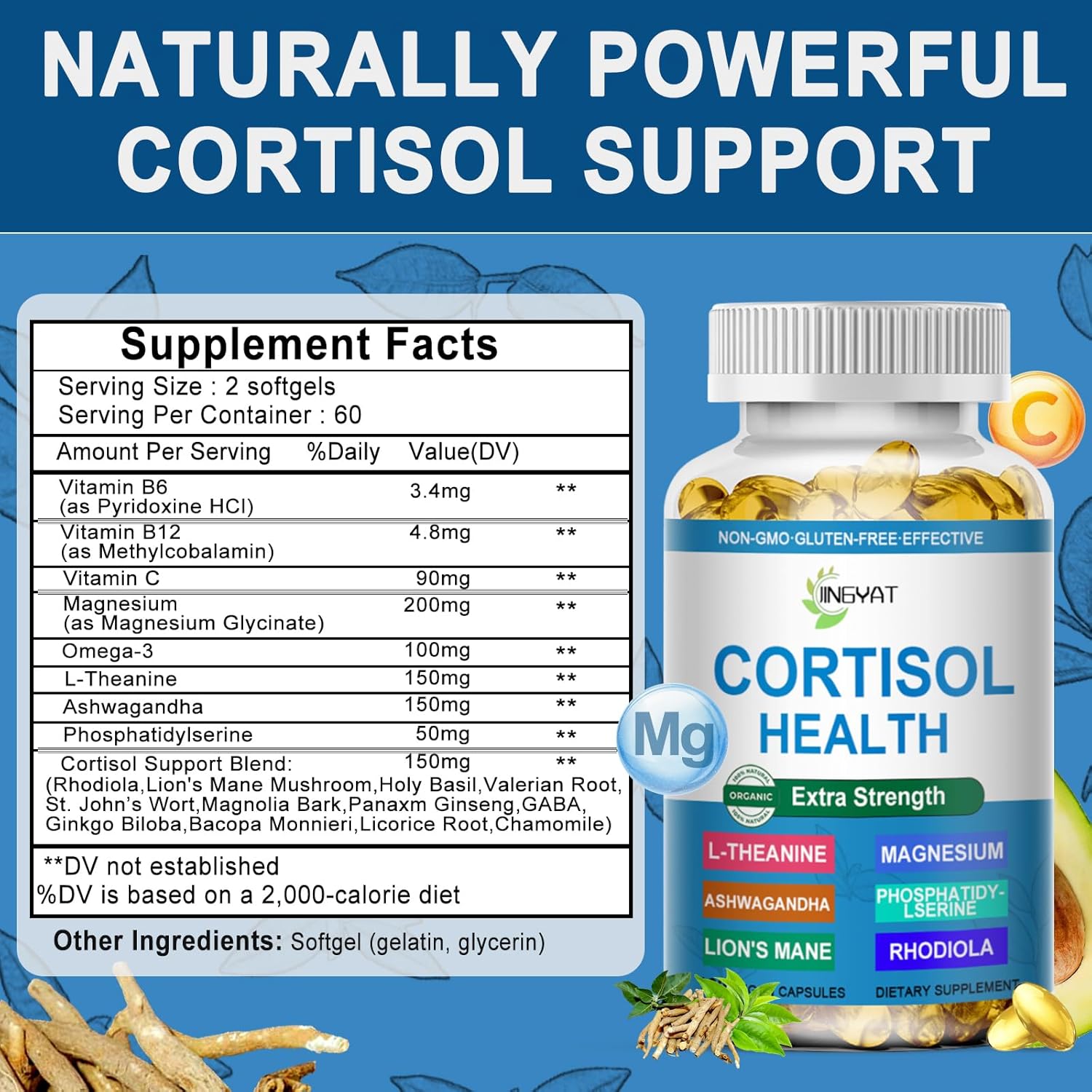 Cortisol Softgels, 20-in-1 Cortisol Supplements for Women w/Magnesium Glycinate Ashwagandha L-Theanine Omega 3 Rhodiola Mushroom – Herbal Cortisol Health Supports Relaxation & Focus,Natural,Non GMO