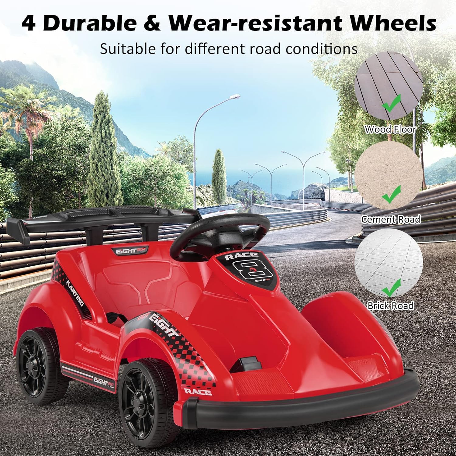Realistic Driving Experience—With built-in 6V battery and strong motor, our kids go cart guarantees a safe speed of 2 mph. Realistic racing car exterior design allows kids to drive as if they were in a real racing scene, enhancing fun and experience. 4 wear-resistant wheels make the car suitable for wood floor, cement road, brick road, rubber track and more.