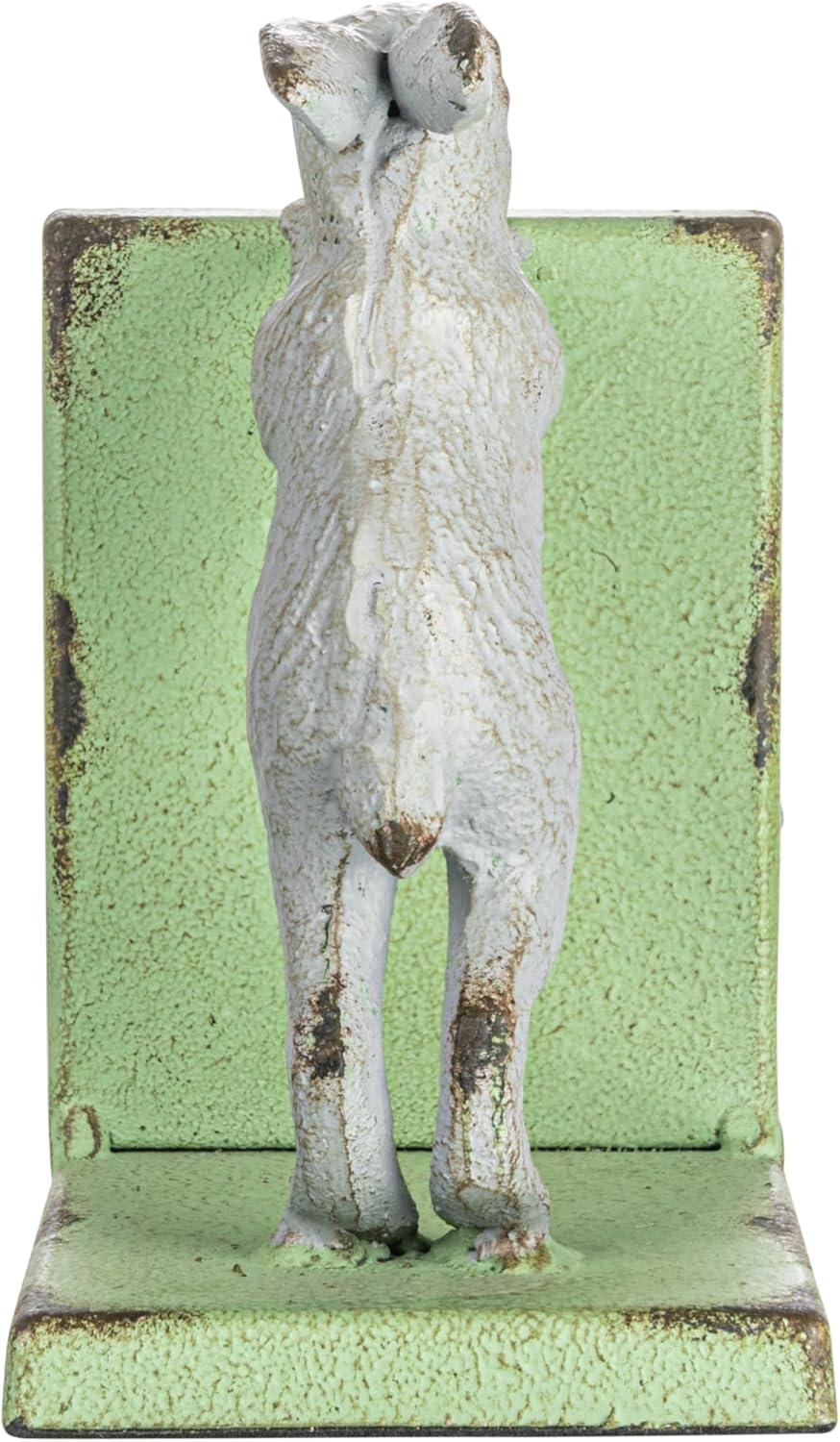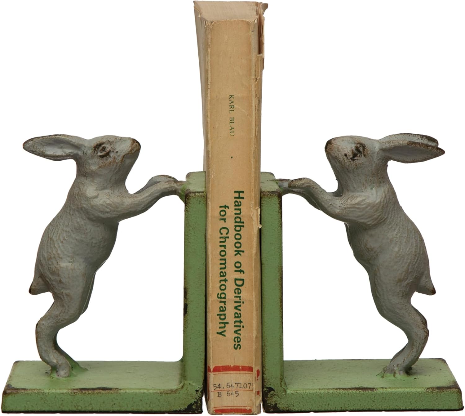 Add some farmhouse-inspired charm and whimsy to the bookshelf with these green and grey cast metal rabbit bookends