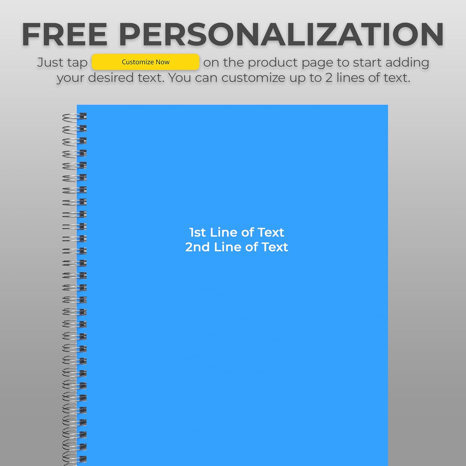 High quality spiral notebooks with personalized text offer a unique and tailored writing experience. These exceptional notebooks, made in the USA, feature an assortment of 6 colored covers and a black spiral twin wire binding. The premium, thick pages are optimized to minimize ink bleed-thru and smearing, ensuring a smooth, seamless writing flow without the frustrations commonly encountered with cheap imported spiral notebooks. These notebooks feature sturdy, thick covers made from premium materials that can withstand daily use and abuse, unlike the flimsy, thin cardboard often found on mass-market notebooks.