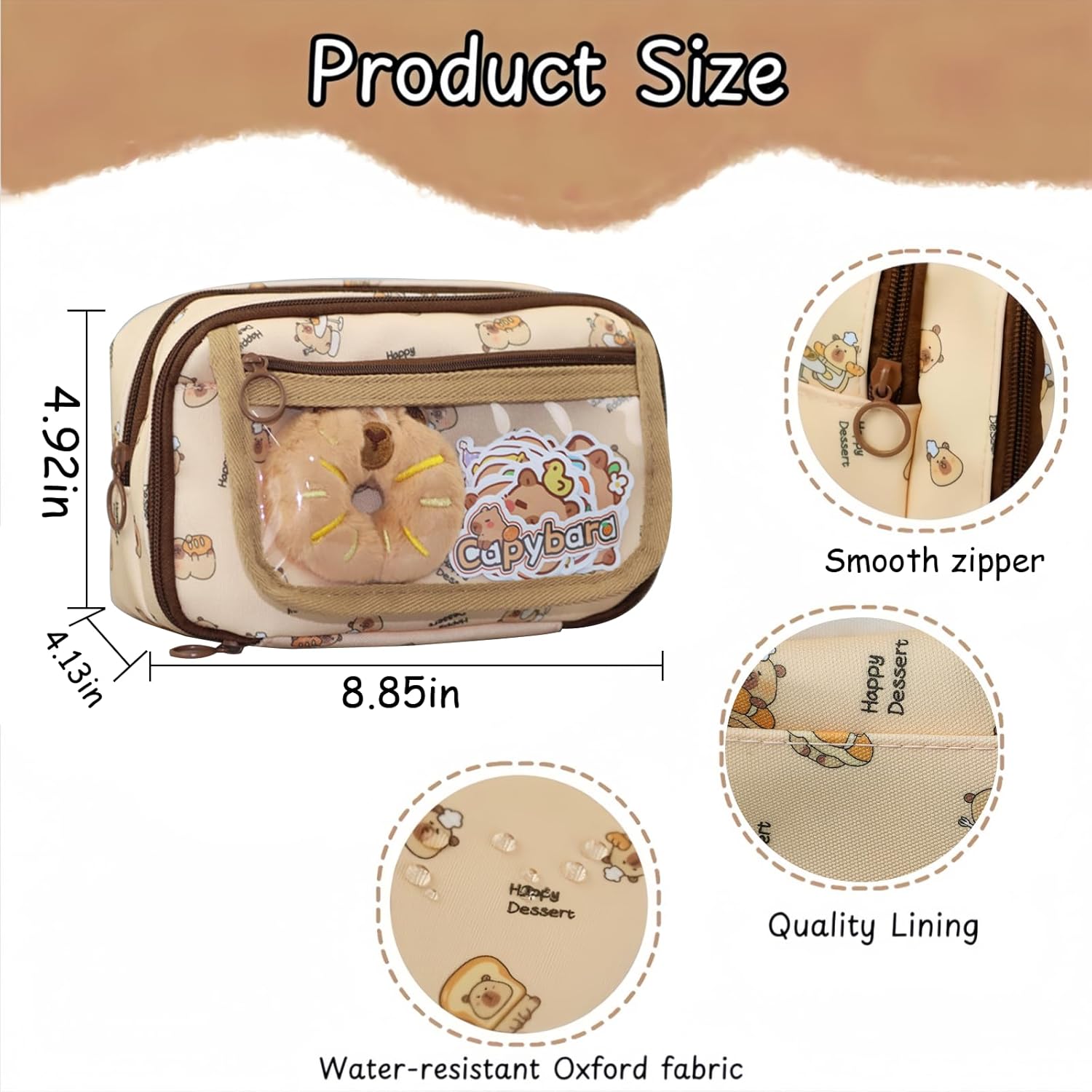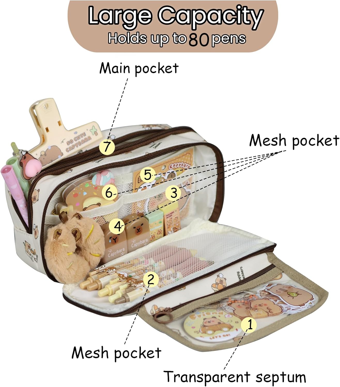Complete School Supplies Set : This all-in-one stationery set includes a large pencil pouch, 4 capybara squeeze pens, 1 spiral notebooks, capybara sticky notes, a memo pad, 6 highlighters, a mechanical pencil with refills, an eraser, scissors, a double-hole sharpener, 50 stickers, and a plush capybara donut — everything kids need for school or home.Please be aware that accessory styles and colors may vary.