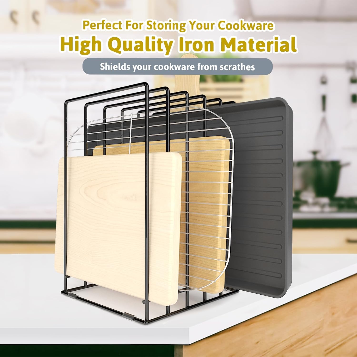 STABLE CONSTRUCTION:The pots and pans organizer is made of high-quality iron wire,which can support the weight of your pan or pot cover,preventing any risk of tipping or falling.The chopping board holder is finished with quality rust coating process for a stylish look.The thoughtful round edge design serves to safeguard against scratches, ensuring both durability and aesthetic appeal