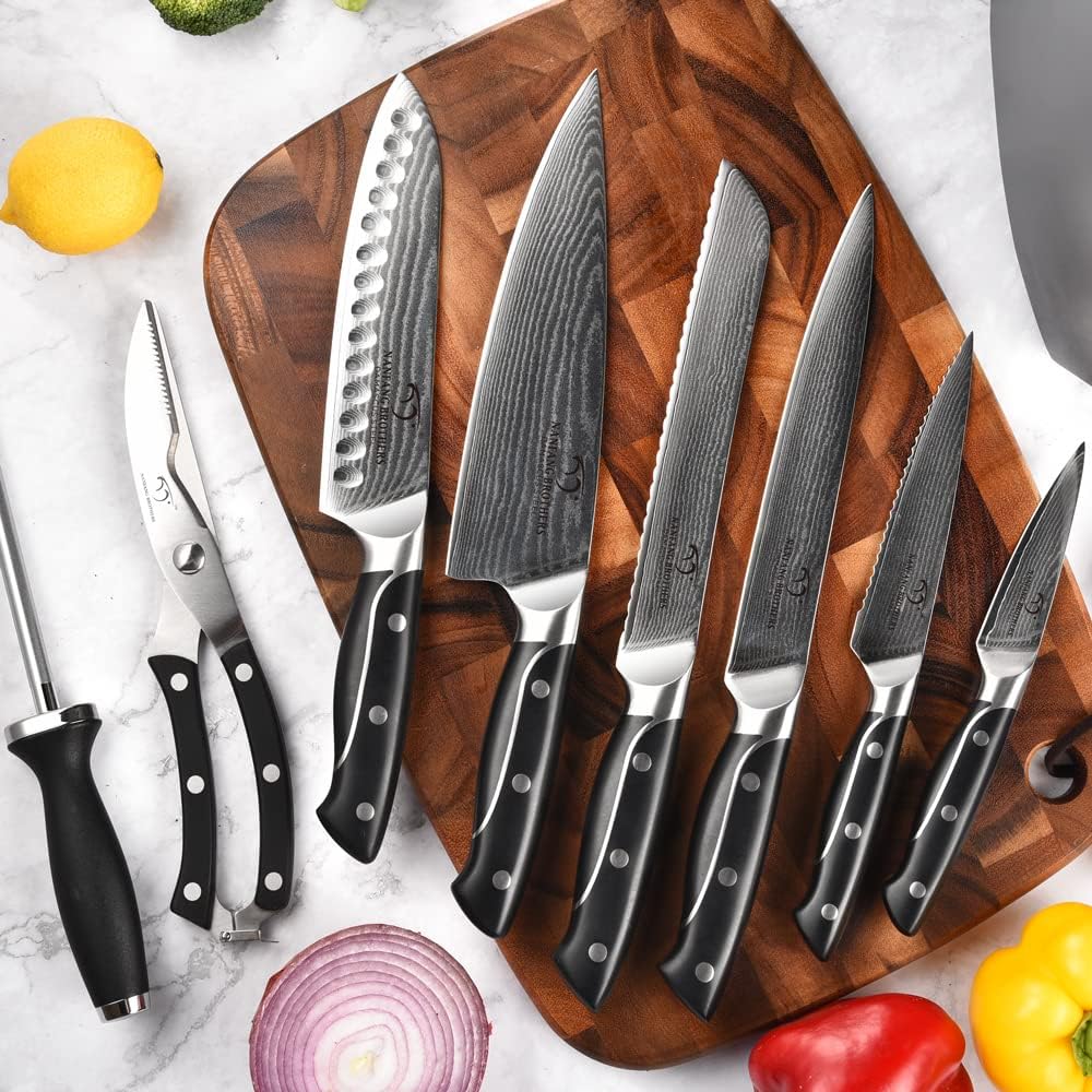 COMPLETE ALL-IN-ONE SET – This professional Damascus knife set includes 8”Chef Knife, 8”Slicing Knife, 8”Bread Knife, 7” Santoku Knife, 5.5”Utility Knife, 3.5”Paring Knife, Kitchen Shears and Knife Sharpener, all neatly organized in a beautiful 8 slots wood block.
