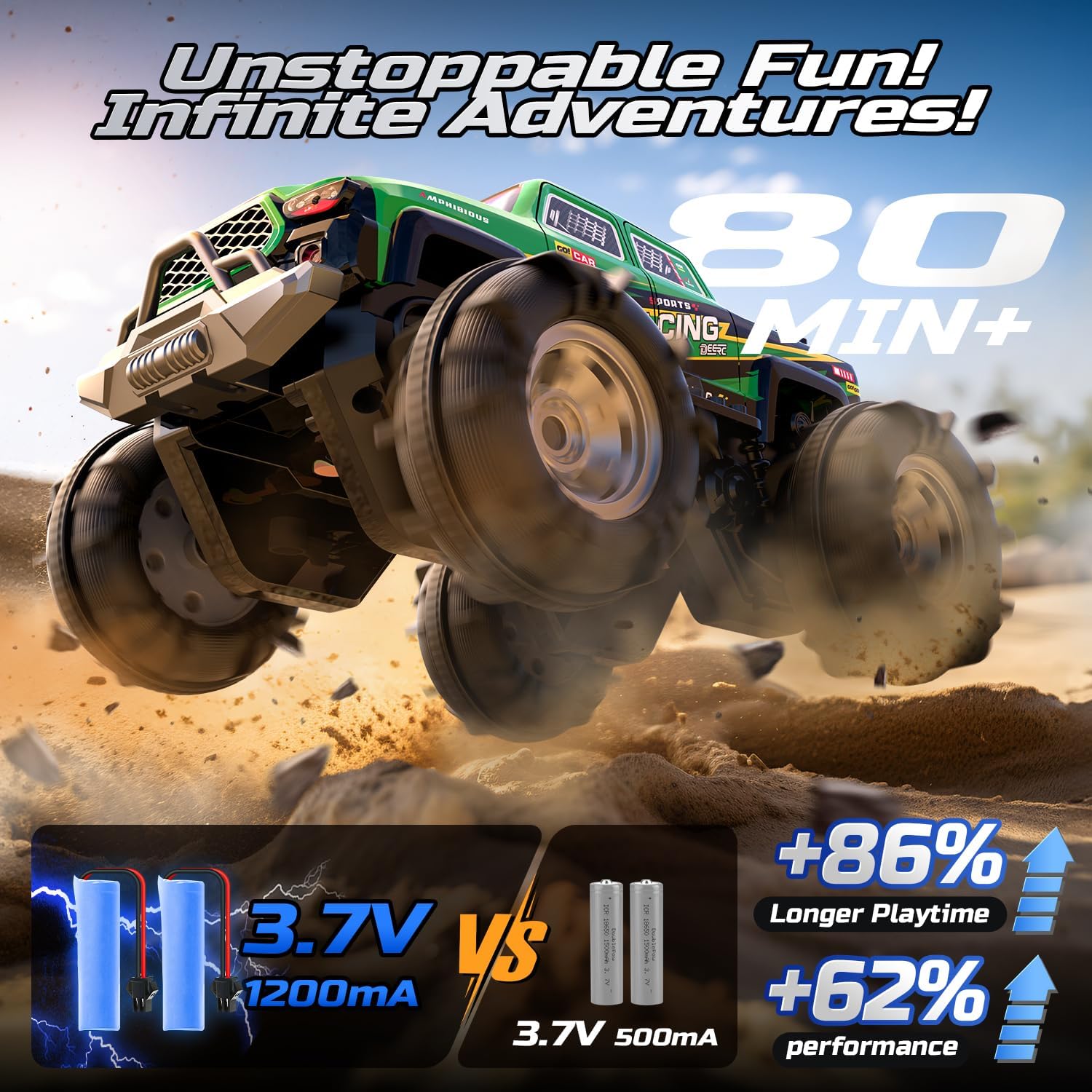 【Amphibious RC Monster Truck】With an IPX7 waterproof feature, this rc truck can drive on both land and water, making it conquer all terrain and perfect for outdoor adventures. Moreover, it can drive upside down underwater and travel on the water surface effortlessly with its super cool double-sided water-driving design. How awesome is it to get one truck that delivers two totally different driving experiences!