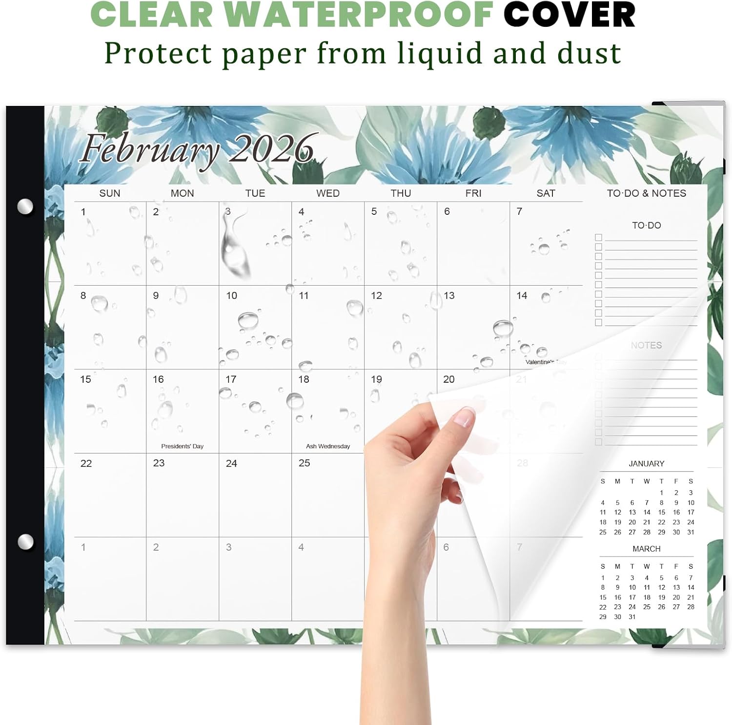 Durable Waterproof Design with Corner Protection – Transparent waterproof cover and sturdy corner protectors shield your calendar from spills, stains, and wear, ensuring lasting use.