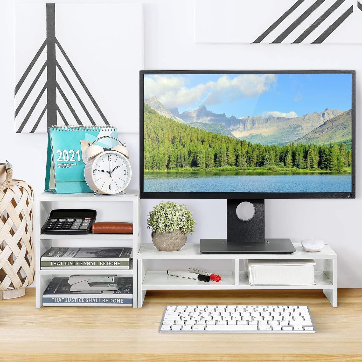 Desk Computer Monitor Stand Riser, Universal Wooden Laptop TV Desktop Monitor Stand with Storage Organizer, 2 Tier Computer Monitor Stands with Three Layer Storage Rack (White)