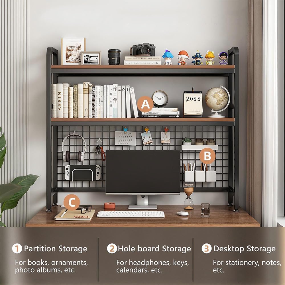 【Ample Storage Space】Featuring three generous tiers, this desk shelf provides plenty of room to books, alarm clocks, photo frames, potted plants, office supplies, phonograph records, cosmetics, etc. The design of the hole board on the back can hang sticky notes and daily small items, which is not easy to lose, making all accessories reachable.