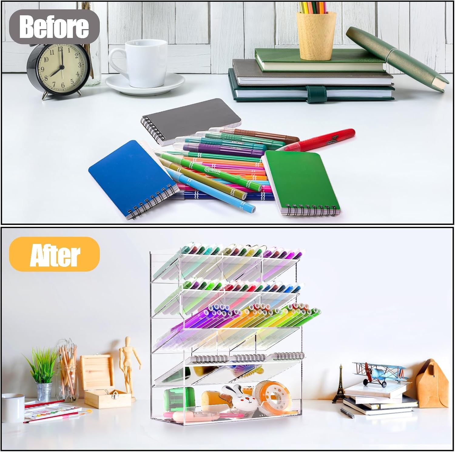 Made of sturdy acrylic material. Thick and stable. Clean and transparency, you can find what you need quickly and easily. Large store space, which allows for display all your pens and other stationery, easy to use.