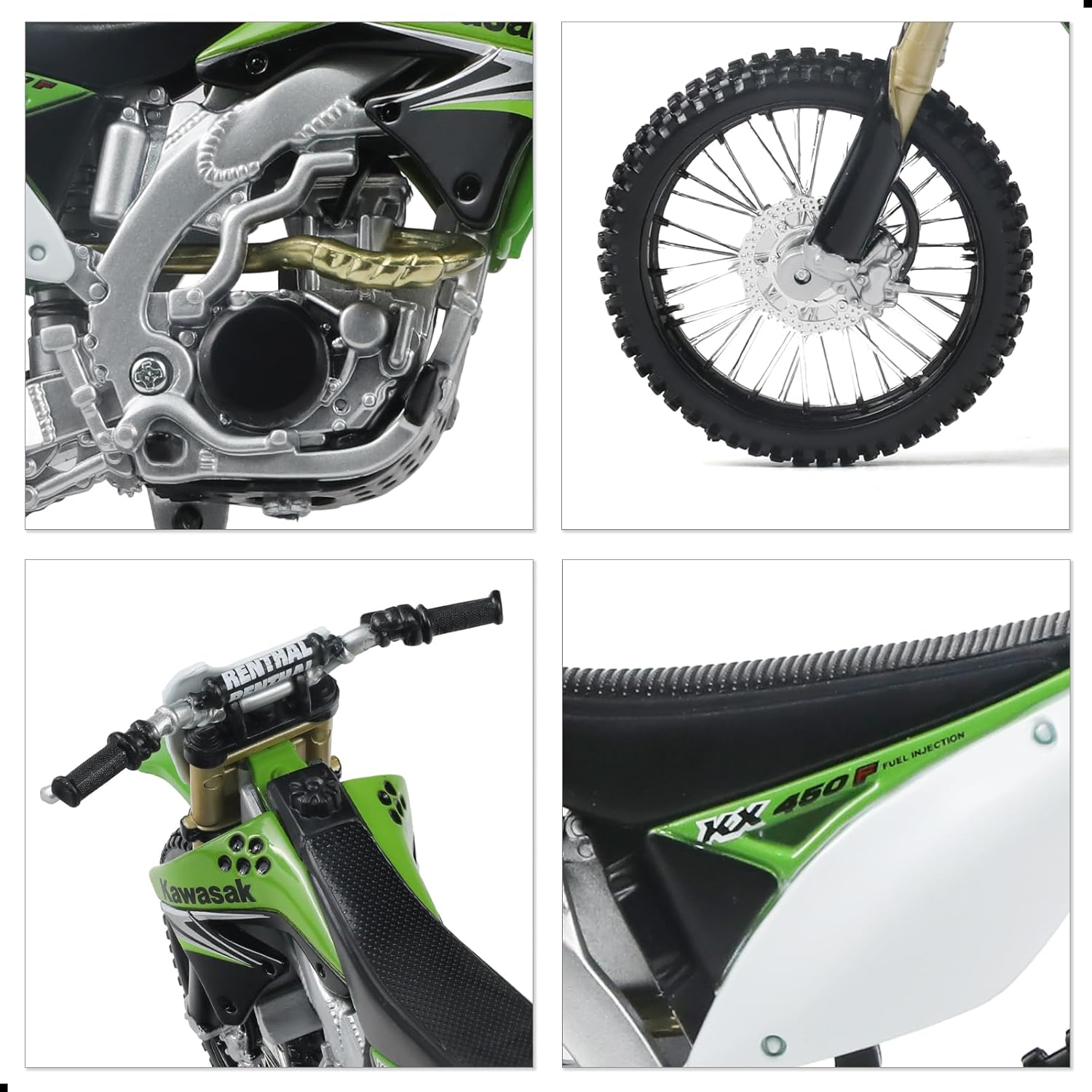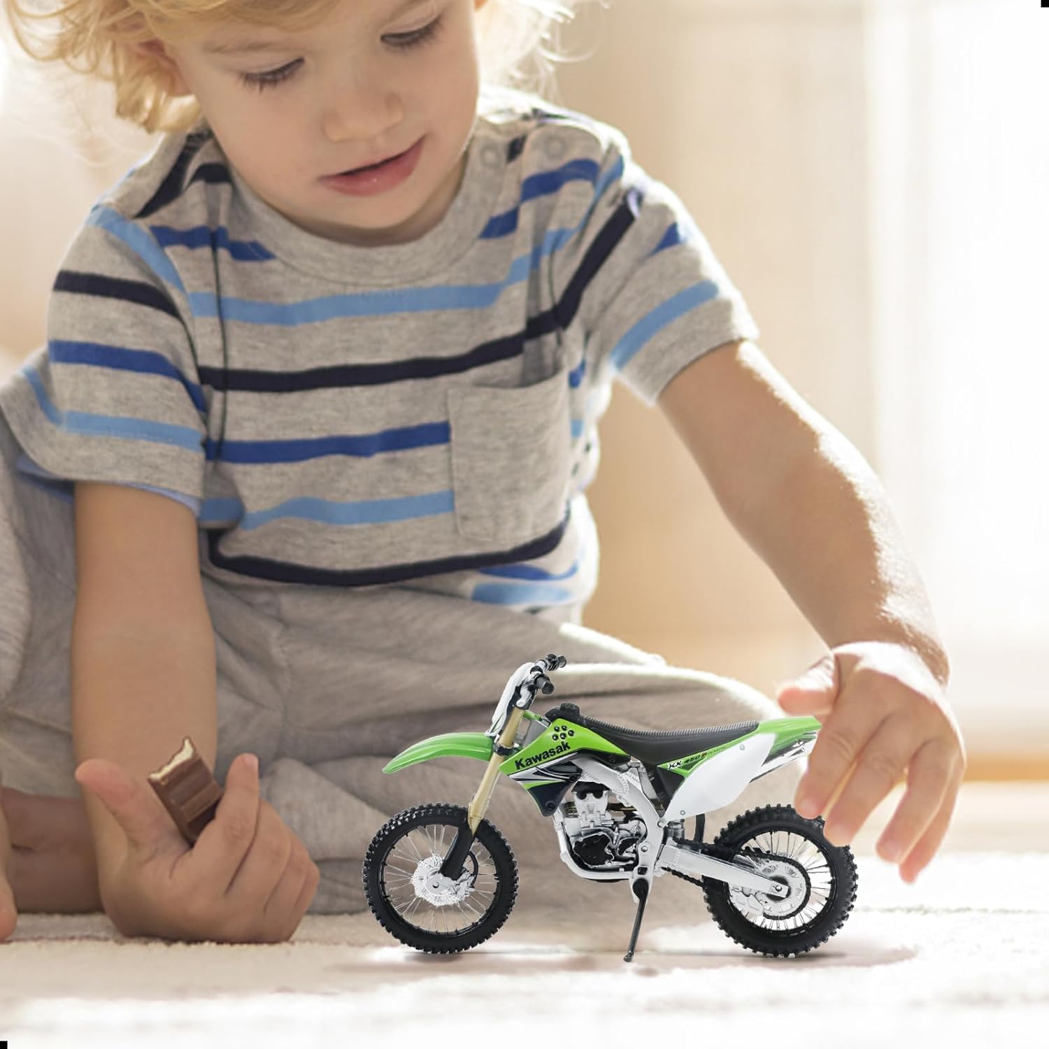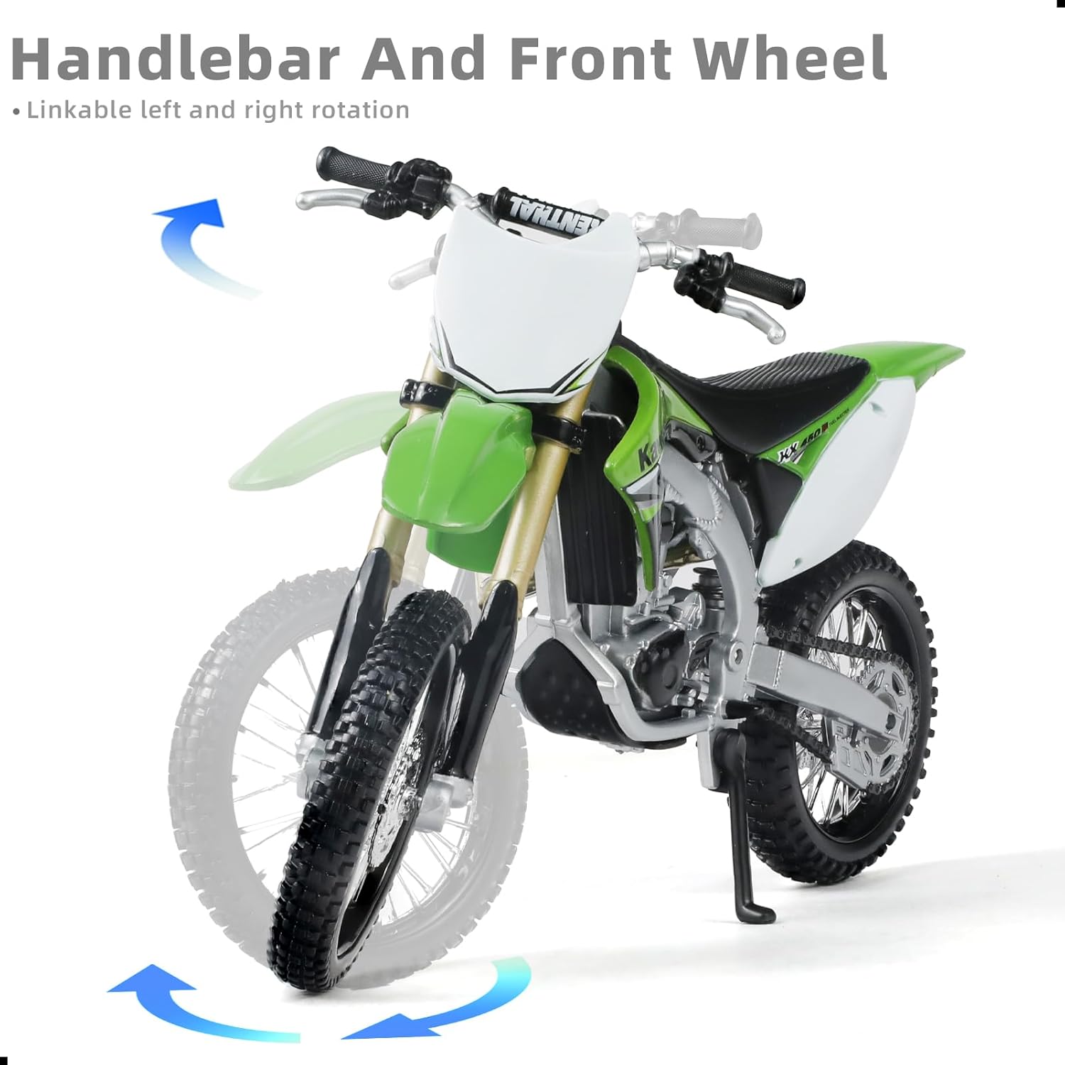 Color and workmanship:This 1:12 scale Compatible for Kawasaki KX450F dirtbike toy is crafted with meticulous attention to detail. Tt features sharp body lines, smooth paintwork, and vibrant colors. Details such as tire treads, exhaust design, handlebars, and suspension are all highly realistic, reflecting the quality of a professional-grade model. Each mini motorbike model toy undergoes strict inspection to ensure it’s safe for kids and toddlers to play with or collect.