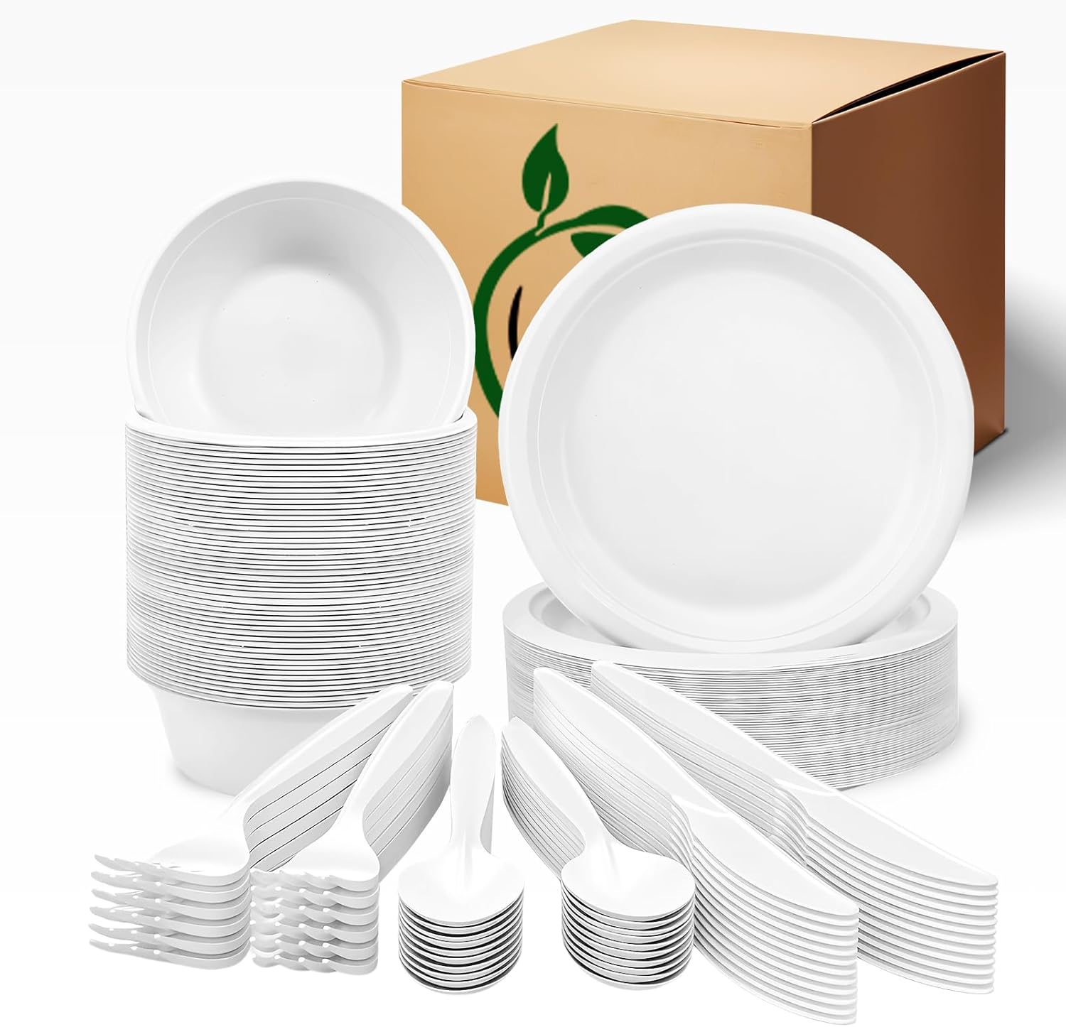50-Set Dinnerware (250 Pieces): Ideal for hosting guests with ease! This paper dinnerware set includes 50 – 9″ dinner disposable plates, 50 sturdy 12oz bowls, 50 – 7″ forks, 50 – 7″ knives and 50 – 7″ spoons, providing full tableware for up to 50 people. You can feel confident knowing these environmentally-friendly pieces are safe for the planet.
