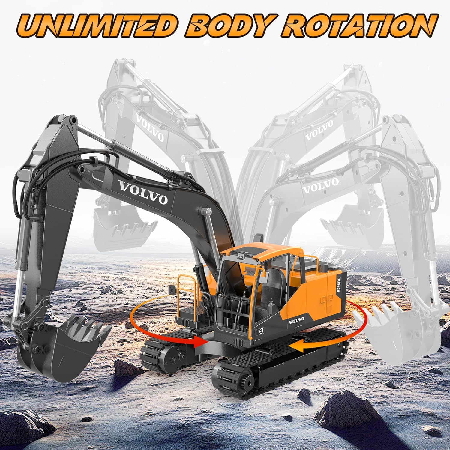 FULLY FUNCTIONAL RC EXCAVATOR: This professional heavy-duty RC excavator toy can move forward/backward, turn right/left, rotate the cab 360° infinitely, independently lift the large and small arms, and rotate clockwise/counterclockwise in place. All functions can be controlled by the remote control.