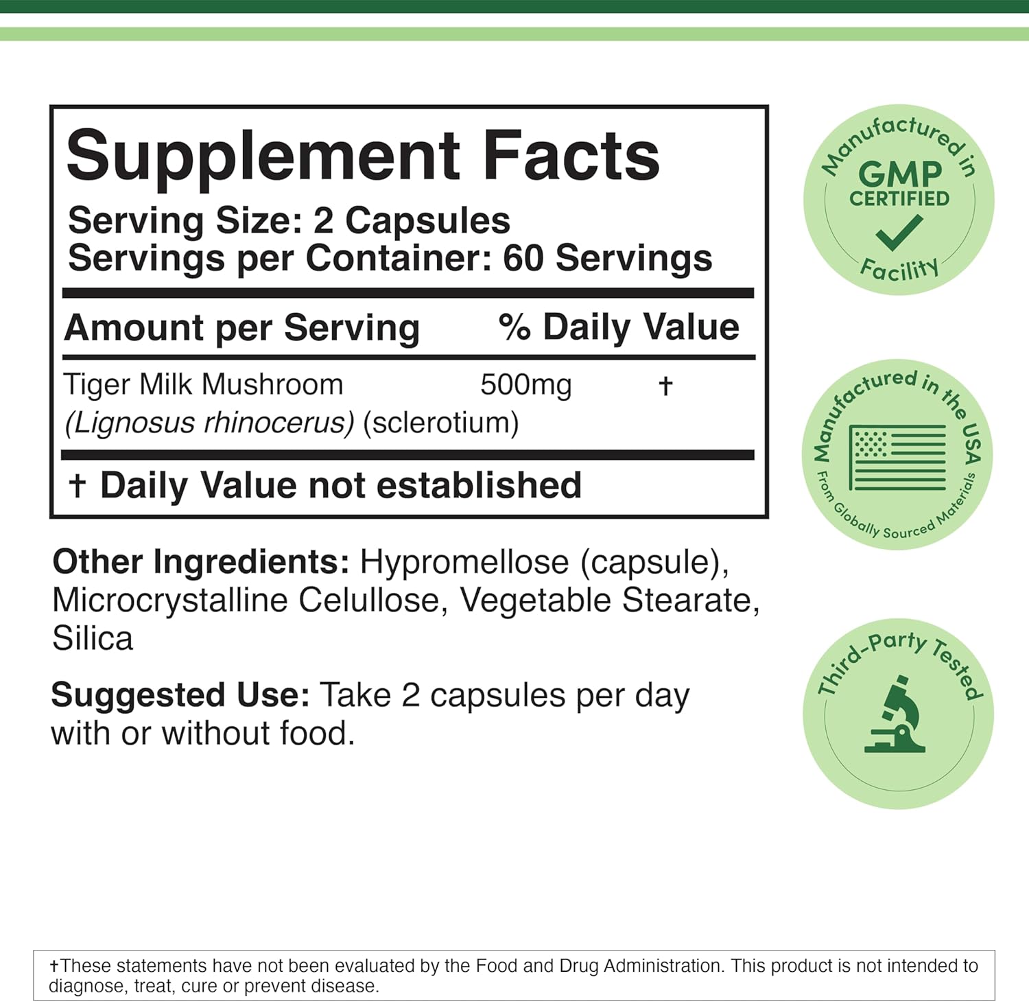TWO MONTH SUPPLY OF TIGER MILK MUSHROOM: Double Wood includes 60 servings of 500mg Tiger Milk Mushroom per serving, enough to last a full 2 months