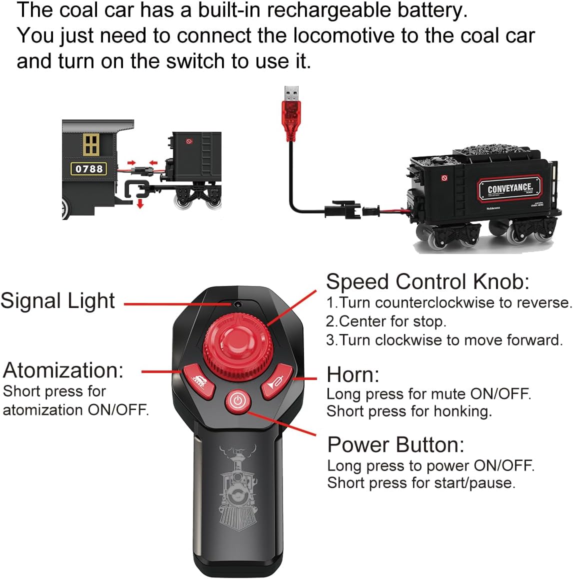【Electric Train Toy with Remote Control】Compared to other ordinary trains on the market, our electric train set use remote controls. It features start switch trumpet / atomization switch, backward / forward and speed adjustment. These functions provides most convenient and most interesting for kids entertainment.