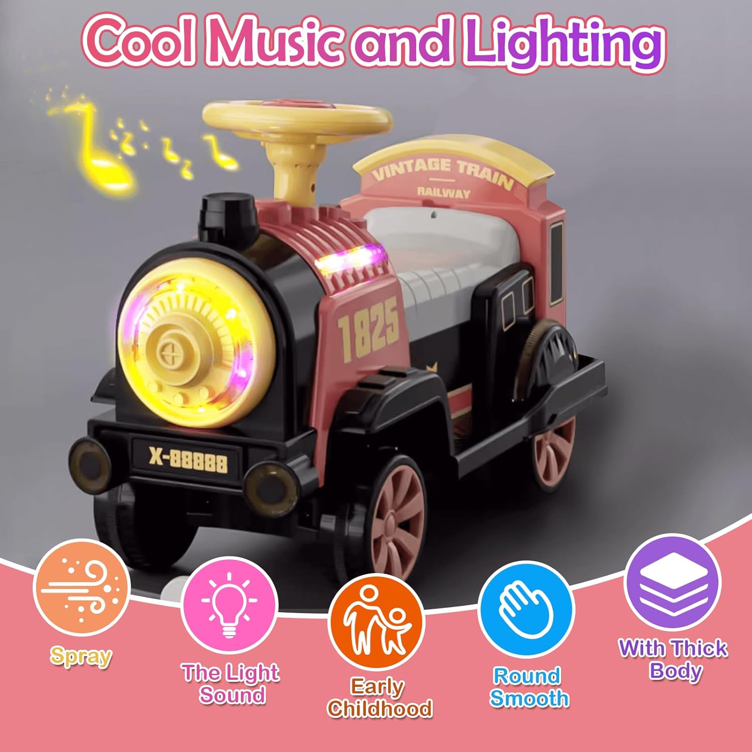 Much More Fun:Dazzling LED lights,simulated spray with water,train whistle sound,built-in music,USB port,and external microphone.Our kids car has richer configurations,bringing more fun