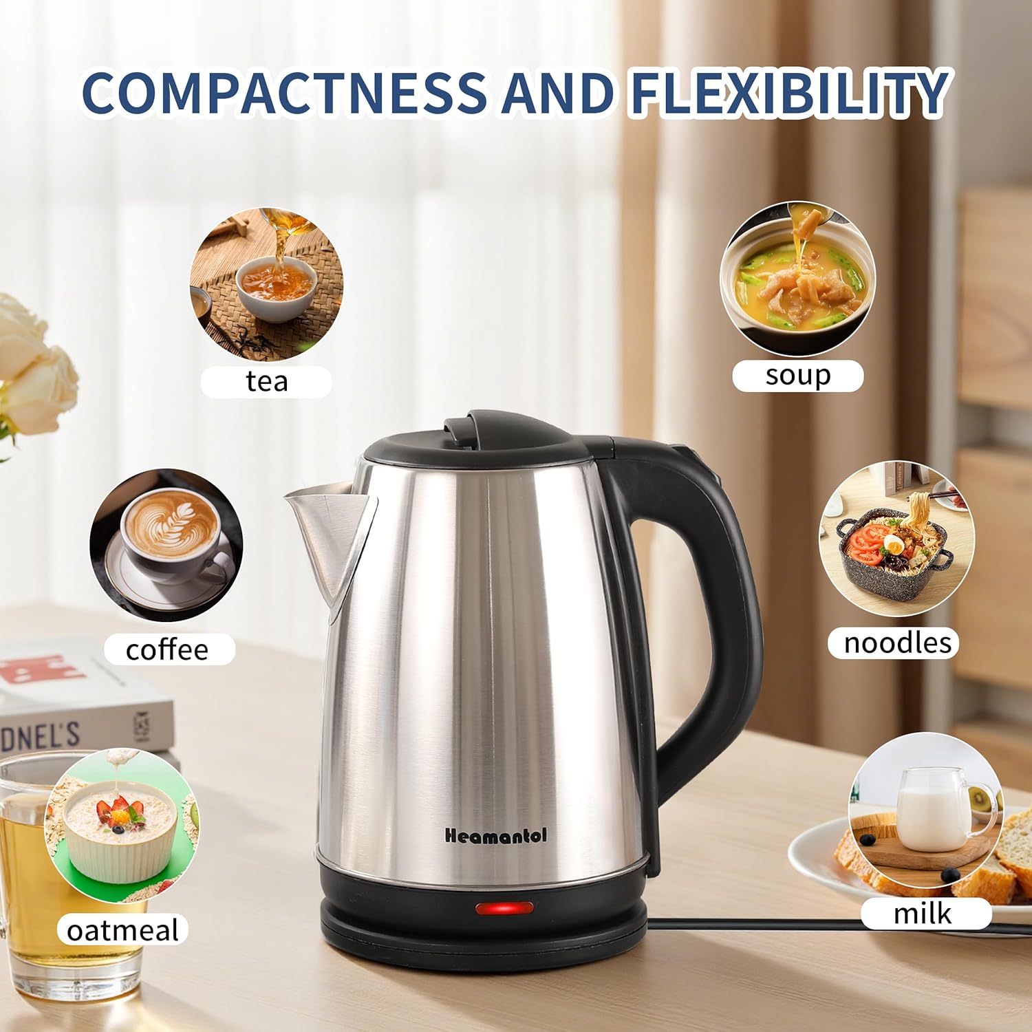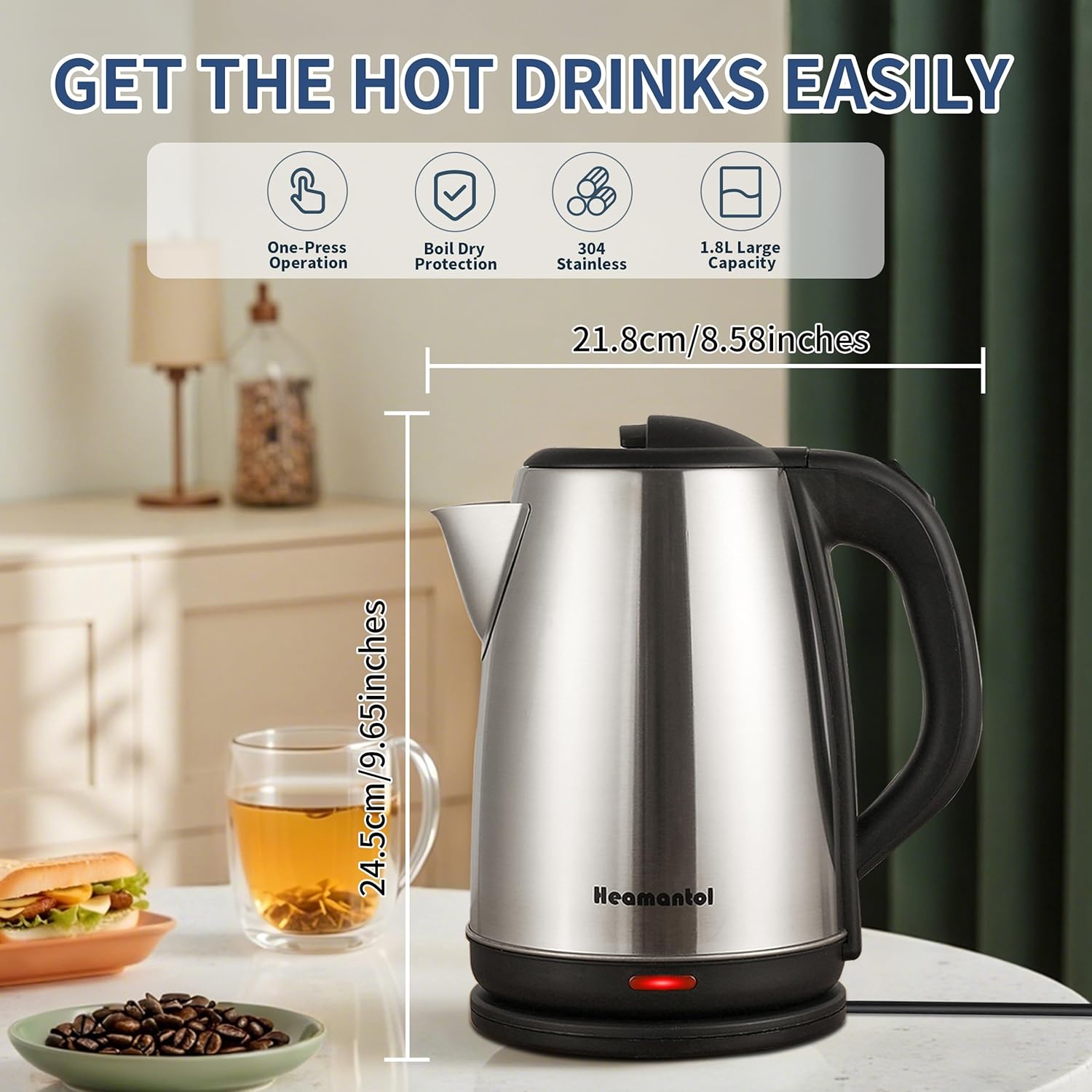 Upgrade your brewing routine with the Heamantol Kitchen Electric Kettle. Combine the performance of a small electric tea kettle with the capacity of a boiler, a sleek design and reliable durability comparable to high-end brands, but at an unbeatable price.