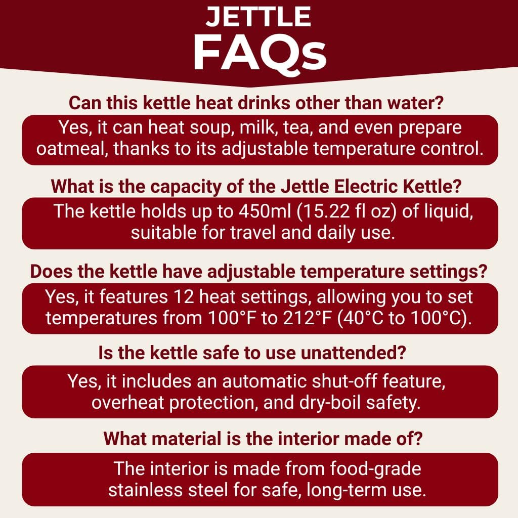 Whip Up Warm Drinks – An Industry LEADING 12 heat settings means The Jettle portable electric kettle’s heating temperature may be adjusted from 100°F to 212°F/40°C to 100°C. Use this portable kettle for cooking hot noodle soup, oatmeal, or milk. Most competitors only have 1-3 settings.